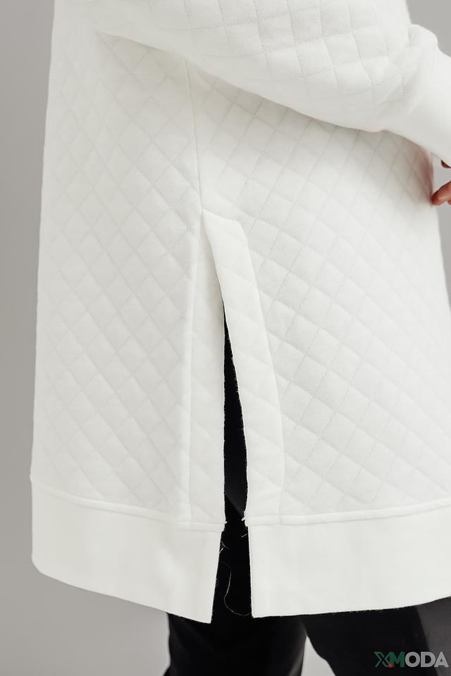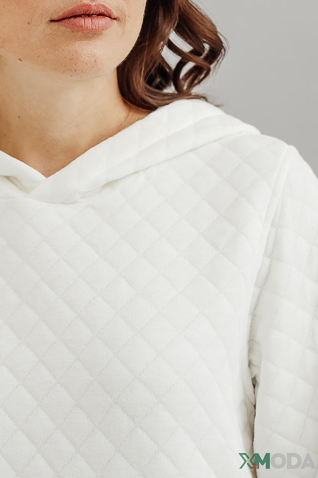 Пуловер имеет объёмный, слегка заниженный крой, который обеспечивает свободу движений и расслабленный силуэт. Стеганая фактура добавляет текстуры и визуального интереса. Капюшон делает модель более практичной и позволяет создавать различные образы.