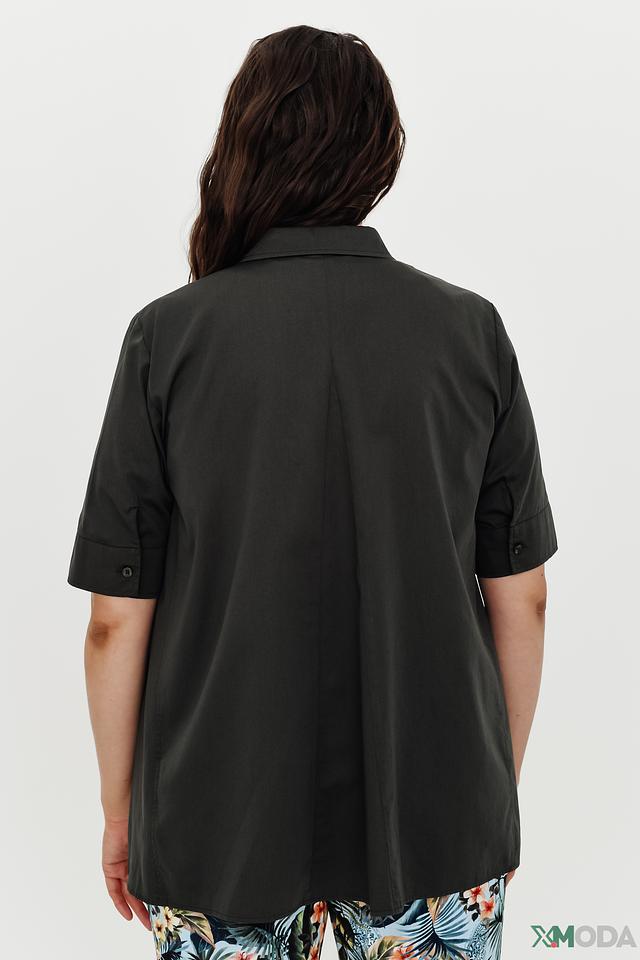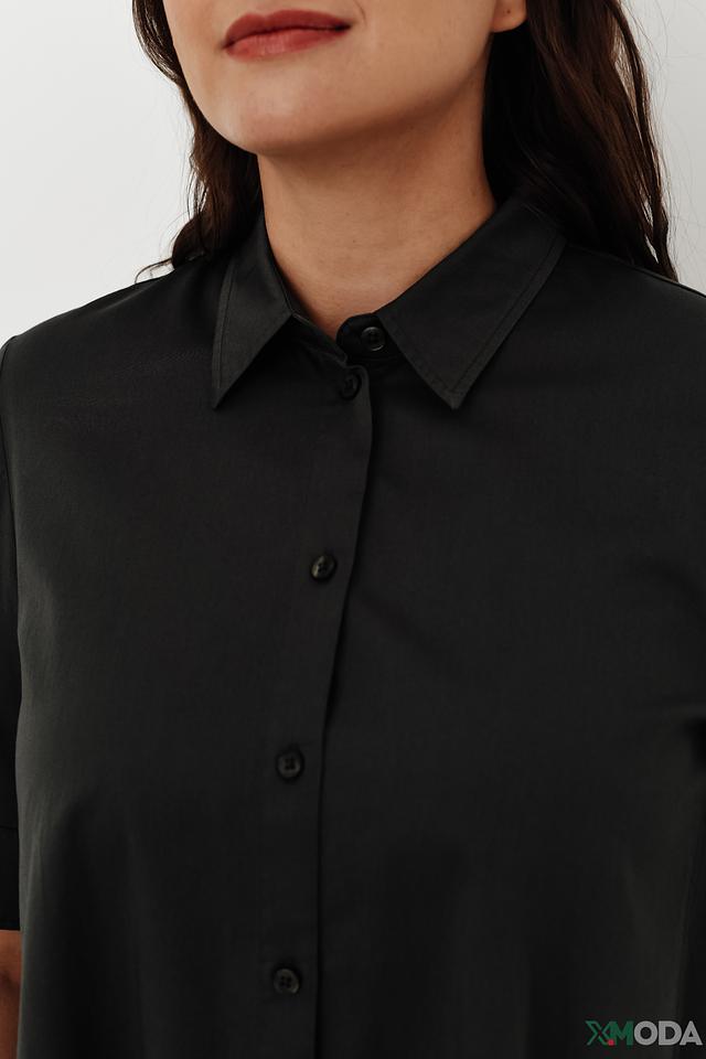 Рубашка имеет прямой силуэт, короткие рукава и традиционный воротник. Застёжка на пуговицы по всей длине. Тёмный, насыщенный чёрный цвет делает эту рубашку подходящей для различных комбинаций с другими предметами одежды.