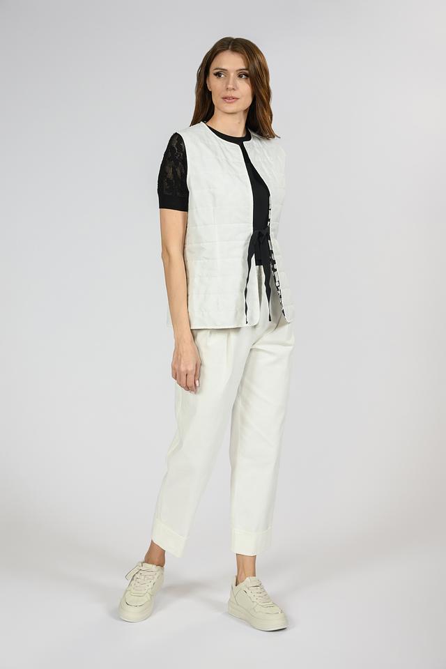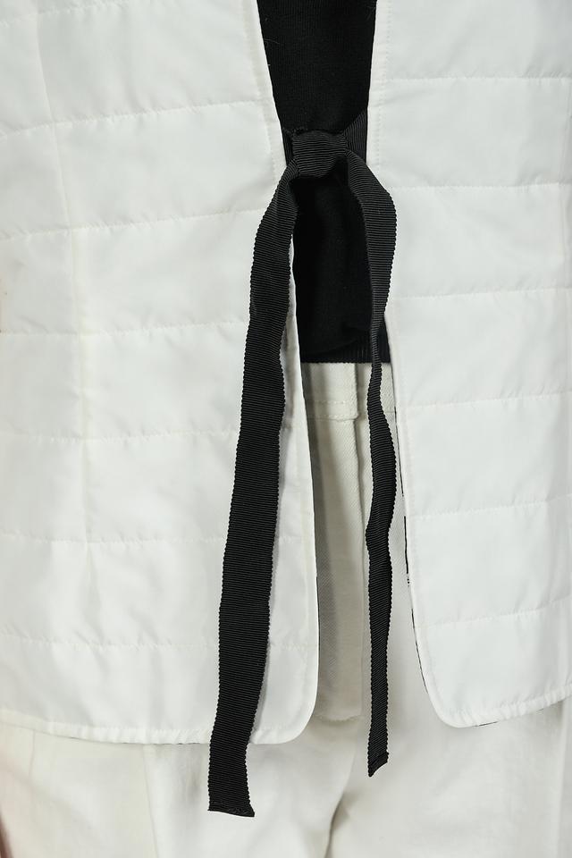 Жилет имеет стеганую фактуру, которая придает ему современный и аккуратный вид. Застежка отсутствует, жилет завязывается на пояс, что позволяет регулировать посадку и подчеркивать фигуру. Модель имеет два накладных кармана.