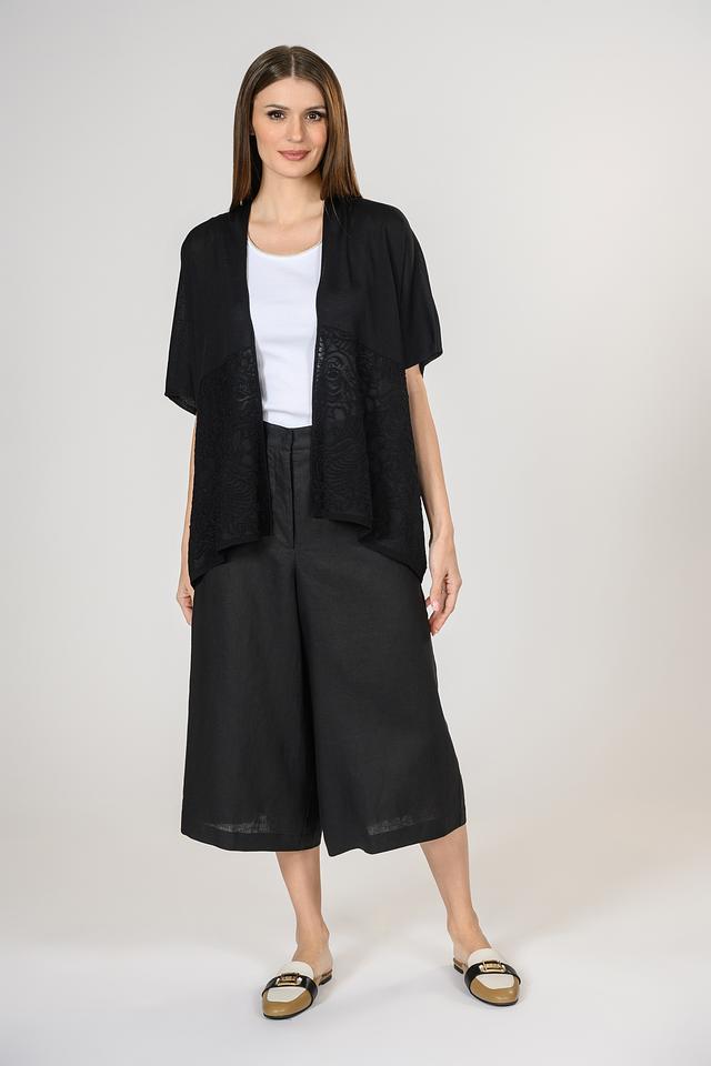 Кардиган имеет свободный крой и короткие рукава, что обеспечивает свободу движений и комфорт в носке. Передняя часть кардигана украшена кружевными вставками, которые придают ему особый шарм и женственность.