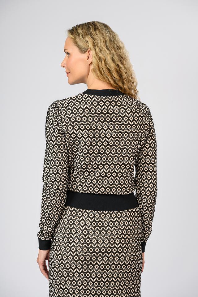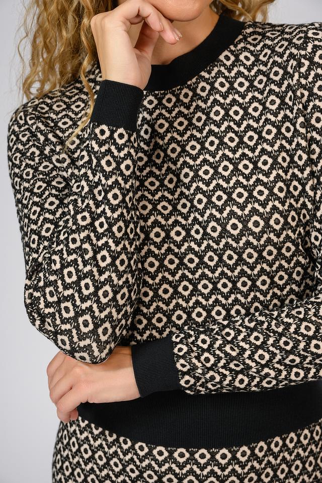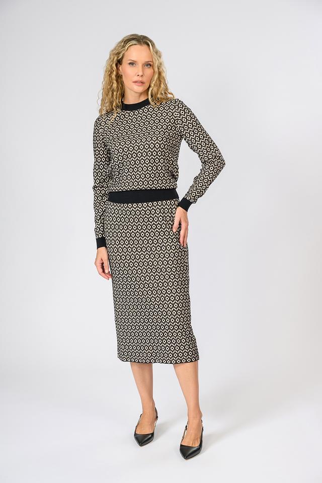Джемпер Giorgio Grati чёрно-бежевого цвета с геометрическим узором. Изготовлен из мягкой вискозы с добавлением полиэстера и шерсти для комфорта и износостойкости. Стильный и универсальный выбор для создания модных образов. Состав: вискоза 80%, полиэстер 12%, шерсть 8%