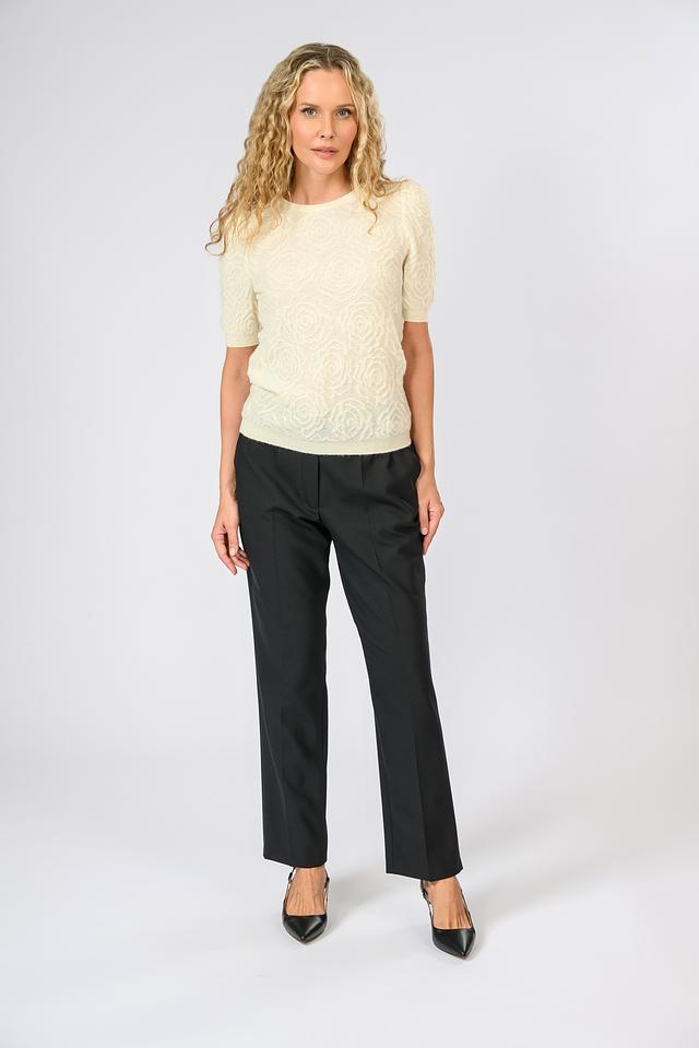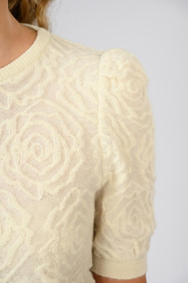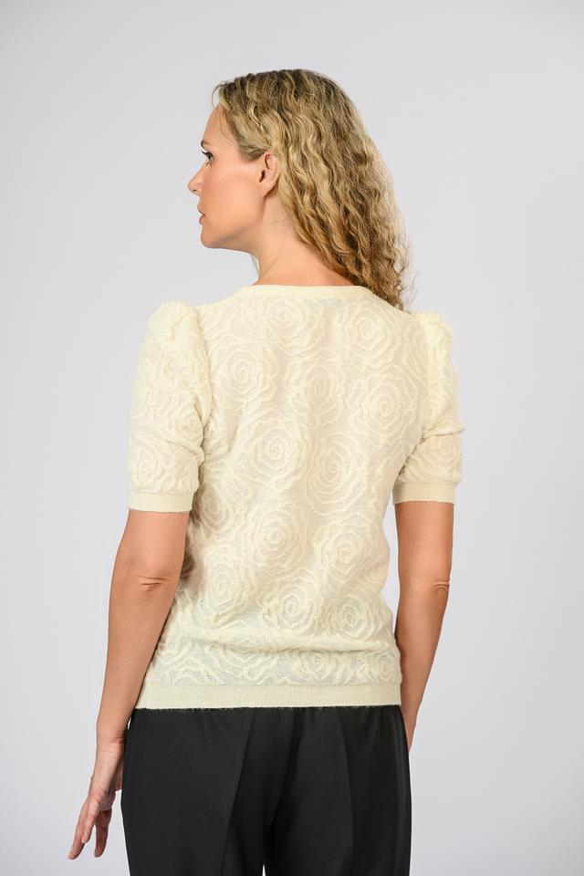 Этот элегантный джемпер от Giorgio Grati выполнен в нежном кремовом цвете и украшен рельефным узором в виде роз. Модель имеет короткие рукава и круглый вырез горловины, что делает ее универсальной для различных образов.