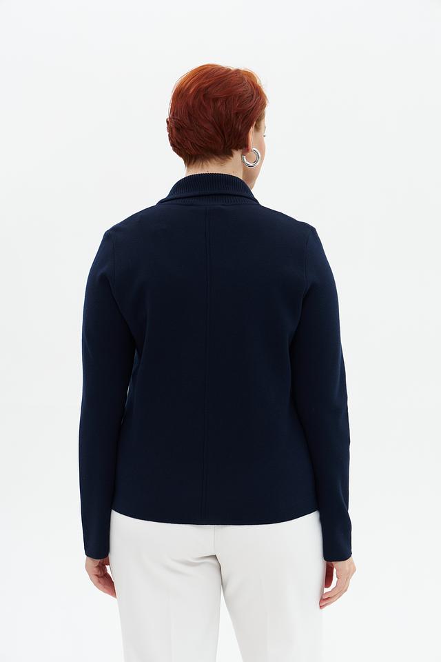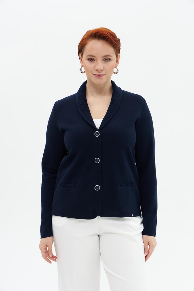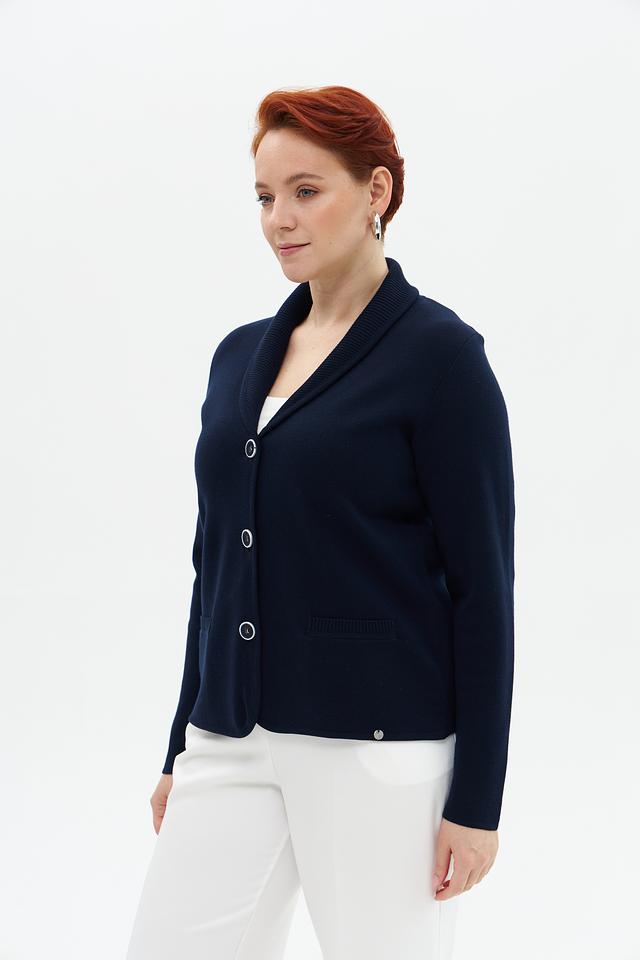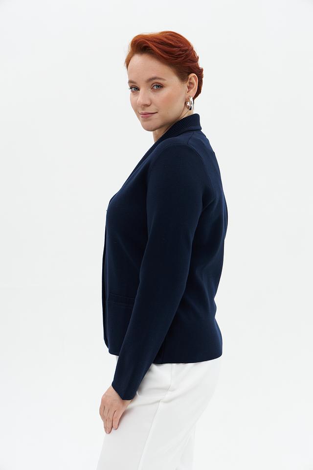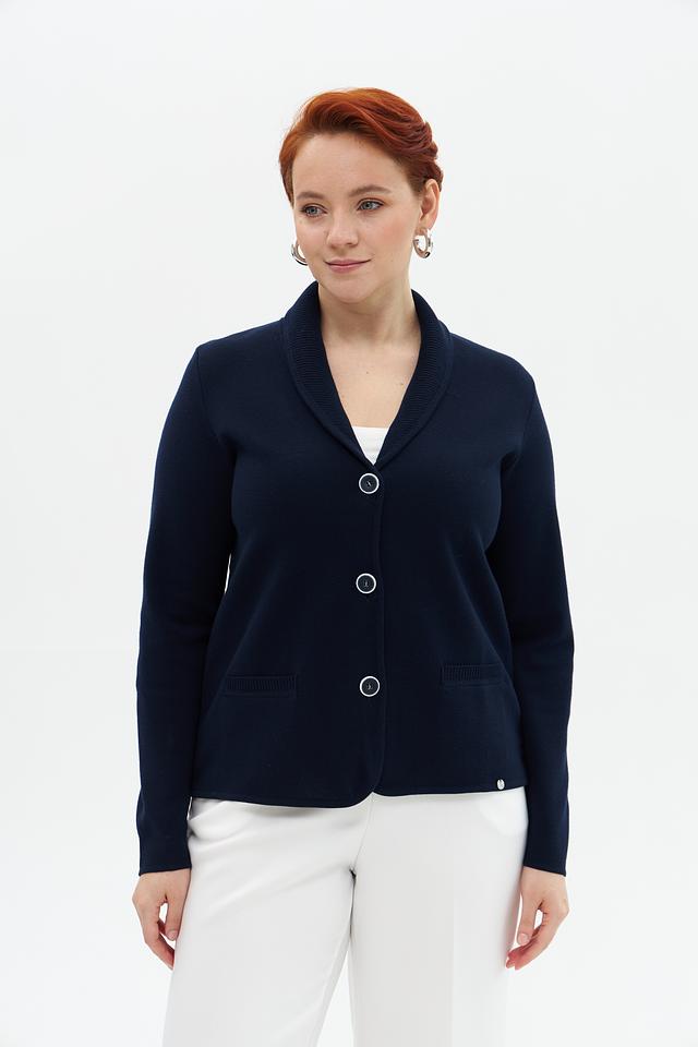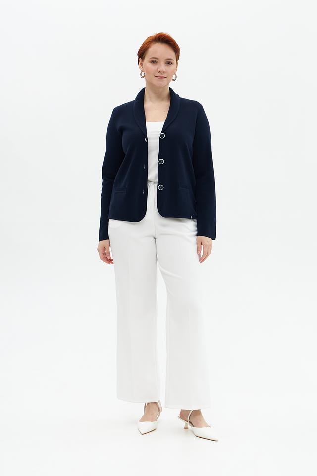 Жакет имеет тёмно-синий цвет, который легко сочетается с различными элементами одежды. Классический крой с отложным воротником и застежкой на три пуговицы придает модели элегантный вид.
