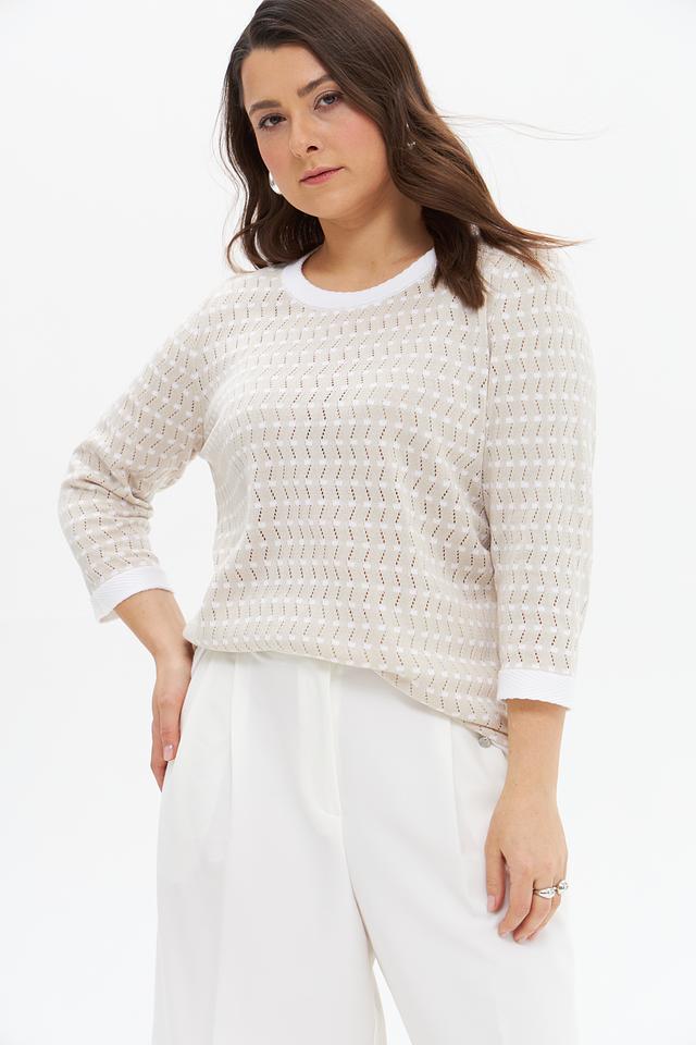 Модель имеет круглый вырез горловины, отделанный белой окантовкой, и рукава 3/4. Пуловер имеет свободный крой, который обеспечивает комфортную посадку по фигуре. Сочетание хлопка и полиакрила делает его приятным к телу и практичным в уходе.