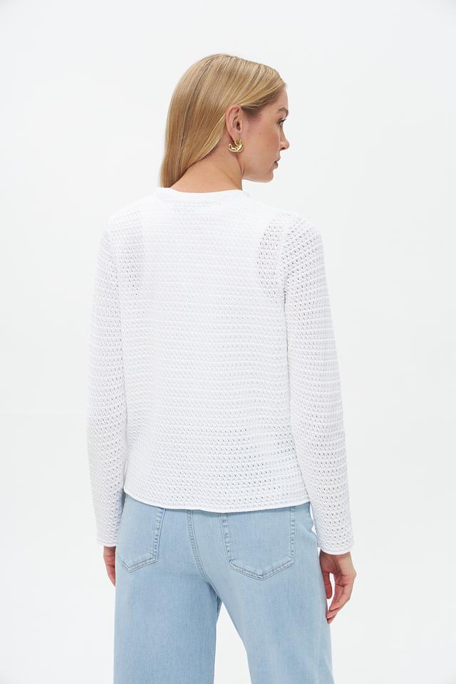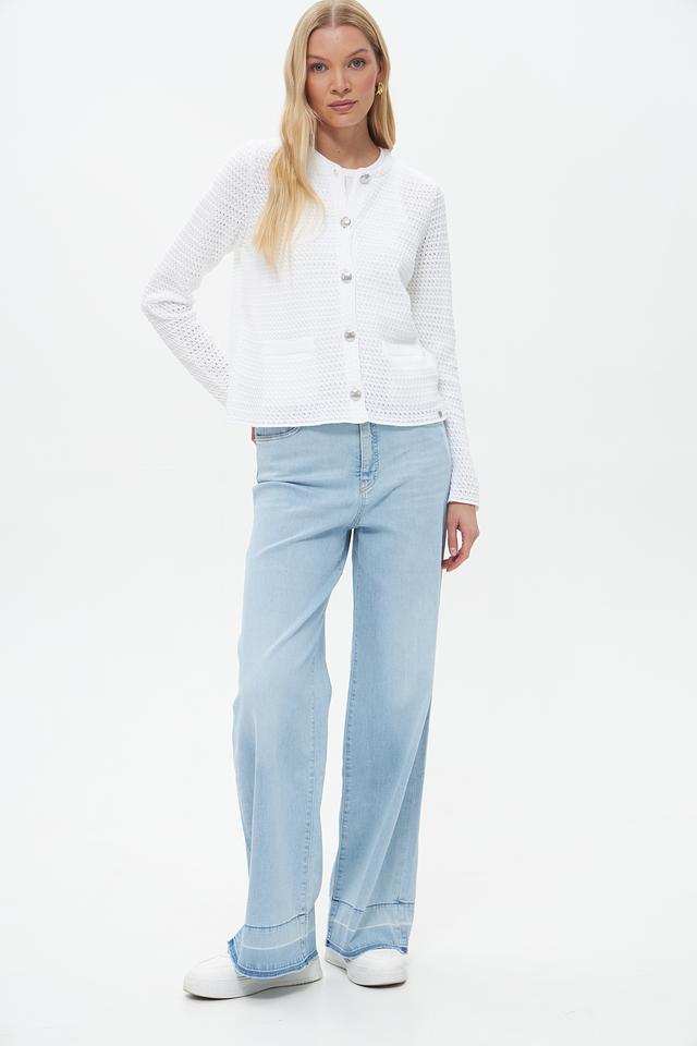 Ажурный узор придает изделию легкость и изысканность. Застежка на пуговицы позволяет регулировать степень прилегания. Длинные рукава и округлый вырез горловины делают этот жакет универсальным для различных образов.