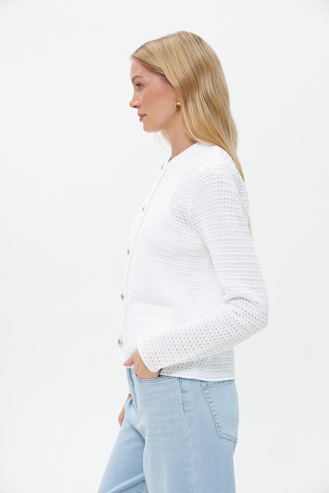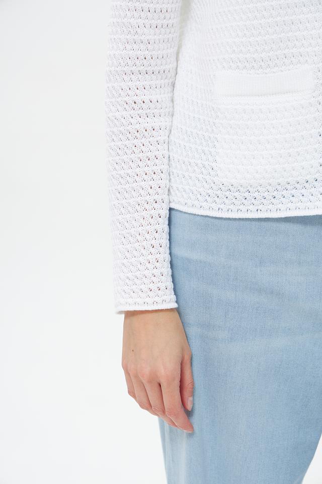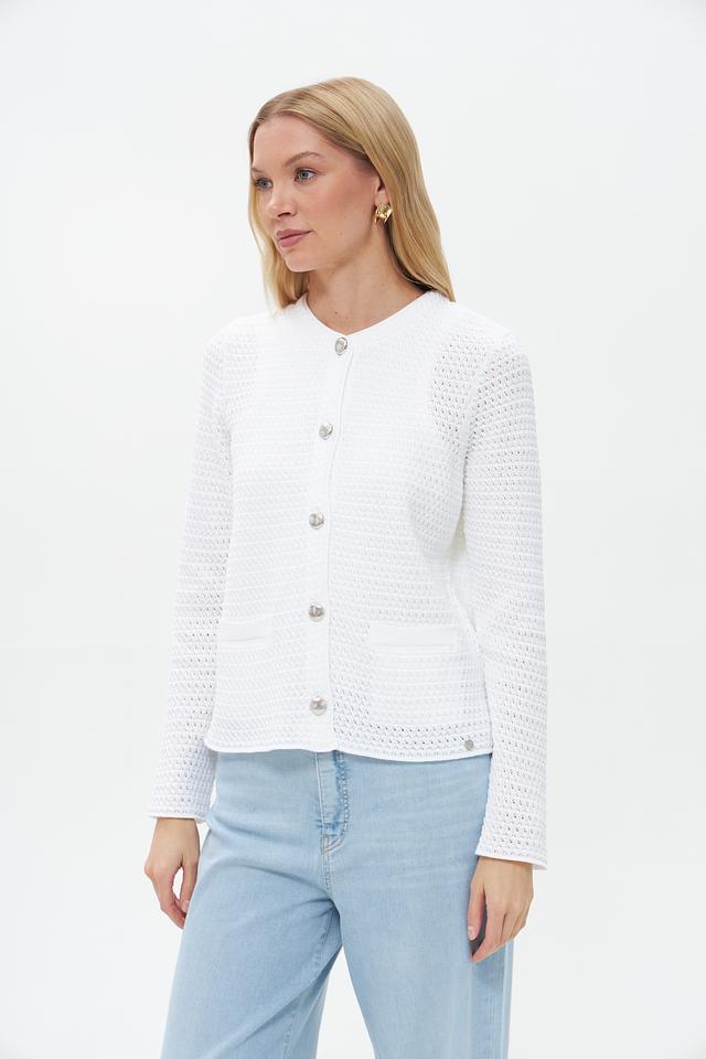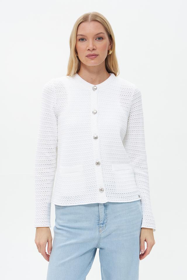 Белый жакет Gollehaug из ажурного трикотажа с застёжкой на пуговицы. Модель имеет длинные рукава и округлый вырез горловины, а также два накладных кармана на передней части. Состав: хлопок 50%, полиакрил 50%
