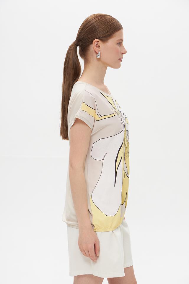 Основной цвет футболки – бежевый, который служит идеальным фоном для яркого и необычного принта в виде стилизованных листьев. Принт выполнен в жёлтых и чёрных тонах, добавляя образу оригинальности и динамики.