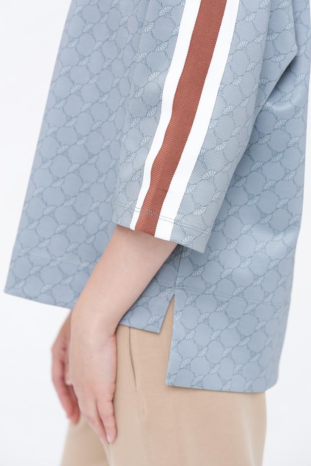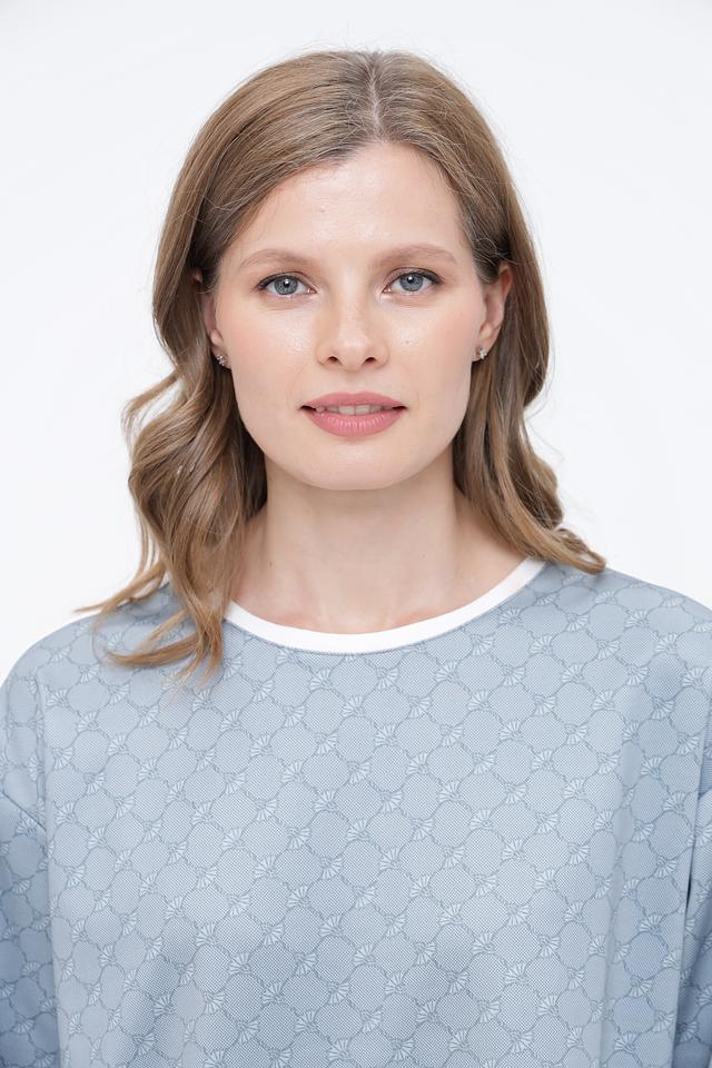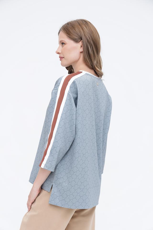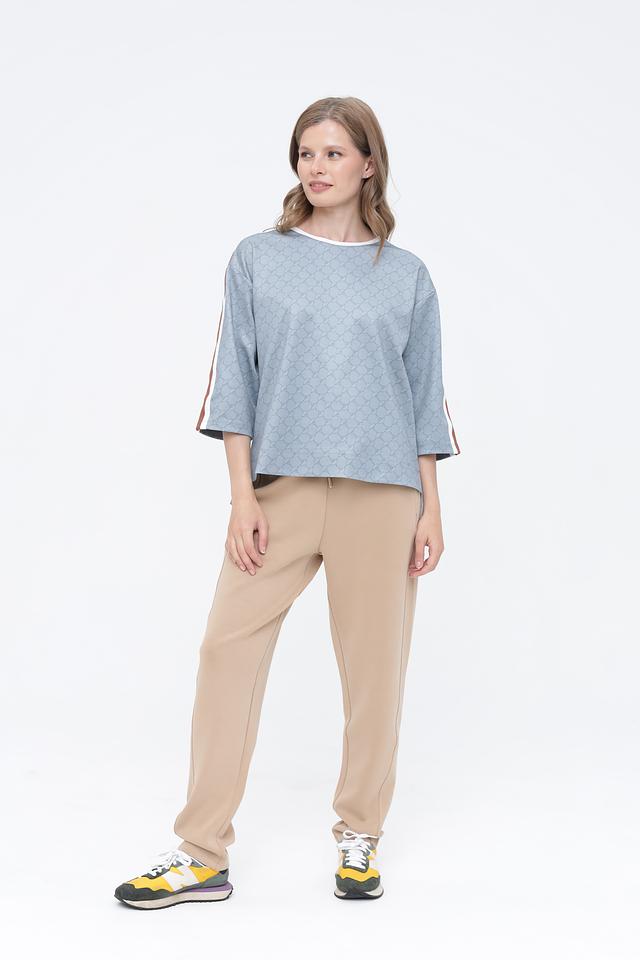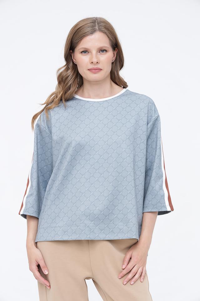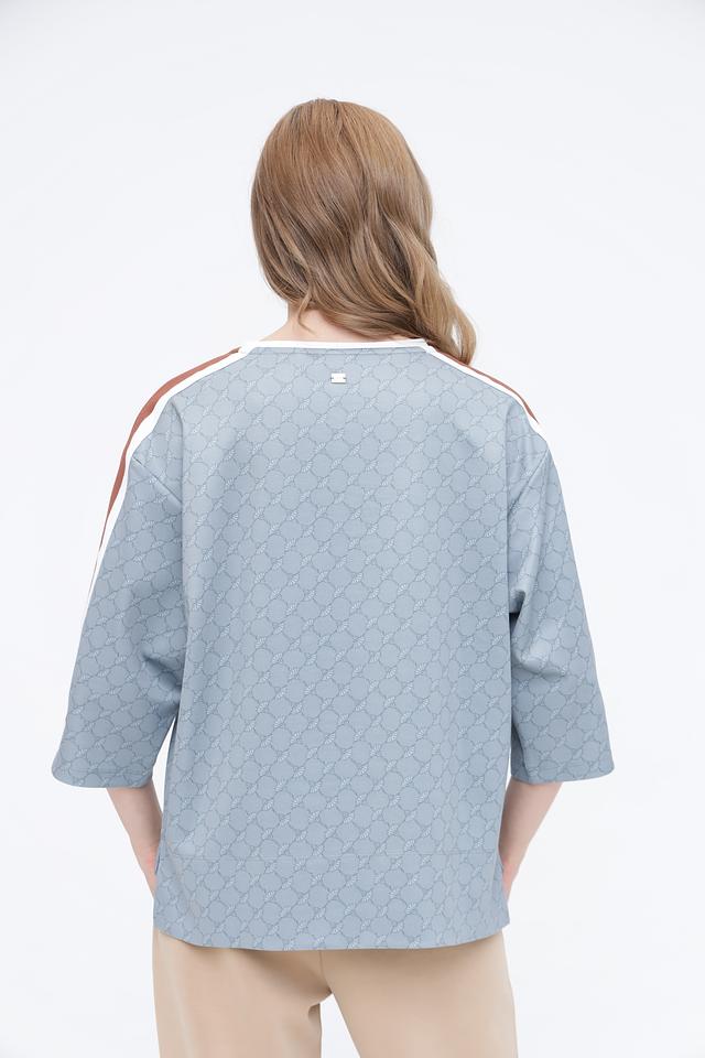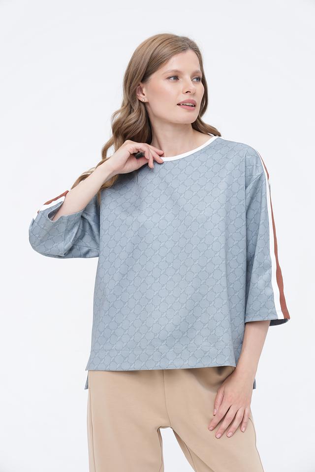 Этот джемпер сочетает в себе классический дизайн и современные акценты. Округлый вырез горловины, укороченные рукава и принт в виде повторяющегося узора добавляют изысканности. Вертикальные полосы по бокам рукавов визуально удлиняют силуэт, делая образ более стройным.