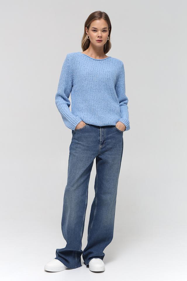 Пуловер имеет классический прямой крой и круглый вырез горловины, что делает его универсальным для различных образов. Текстурная вязка придает изделию особый шарм и объём. Голубой цвет пуловера легко сочетается с другими элементами одежды, позволяя создавать разнообразные стильные комплекты.