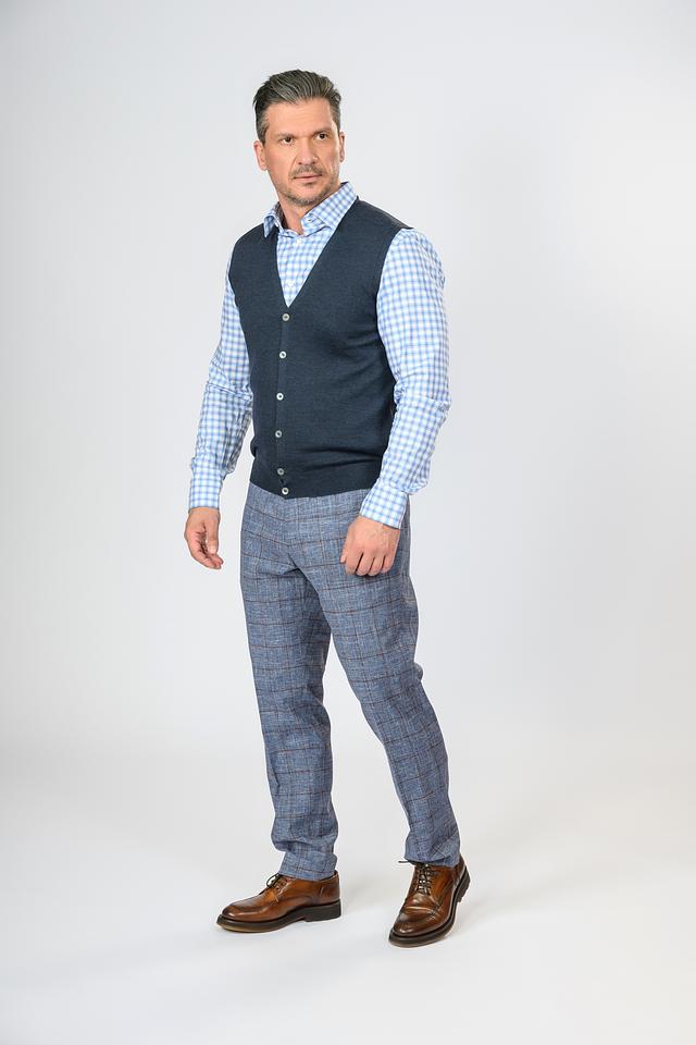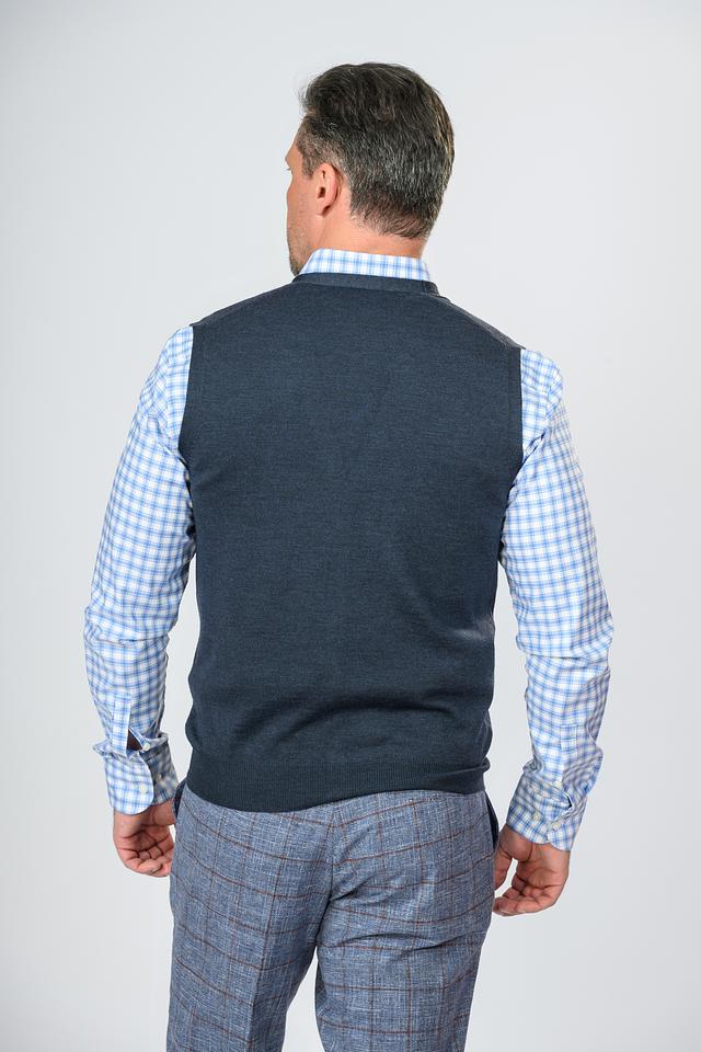 Жилет имеет классический крой, который хорошо сочетается с рубашками и брюками. Тёмно-синий цвет делает его универсальным и подходящим для различных случаев. Застёжка на пуговицы обеспечивает удобство надевания и снятия.