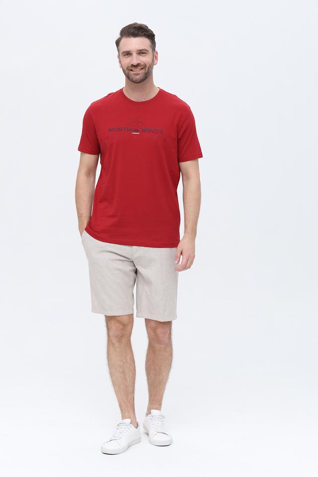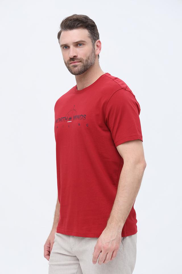 Основной цвет футболки – насыщенный красный. На груди расположен оригинальный принт в синих тонах с изображением гор и надписью "NORTH WINDS SAILING". Принт добавляет футболке индивидуальности и стиля.