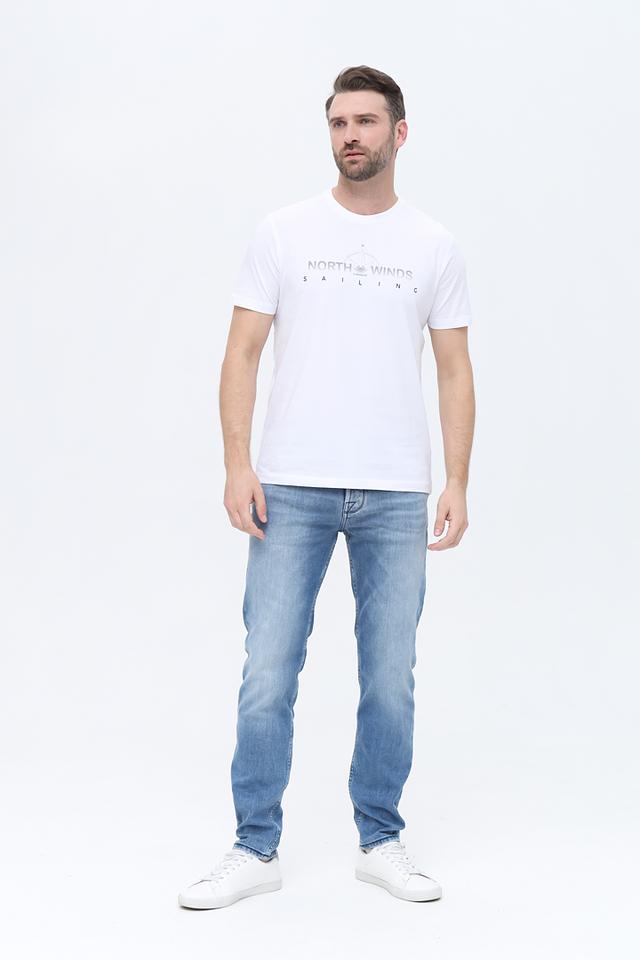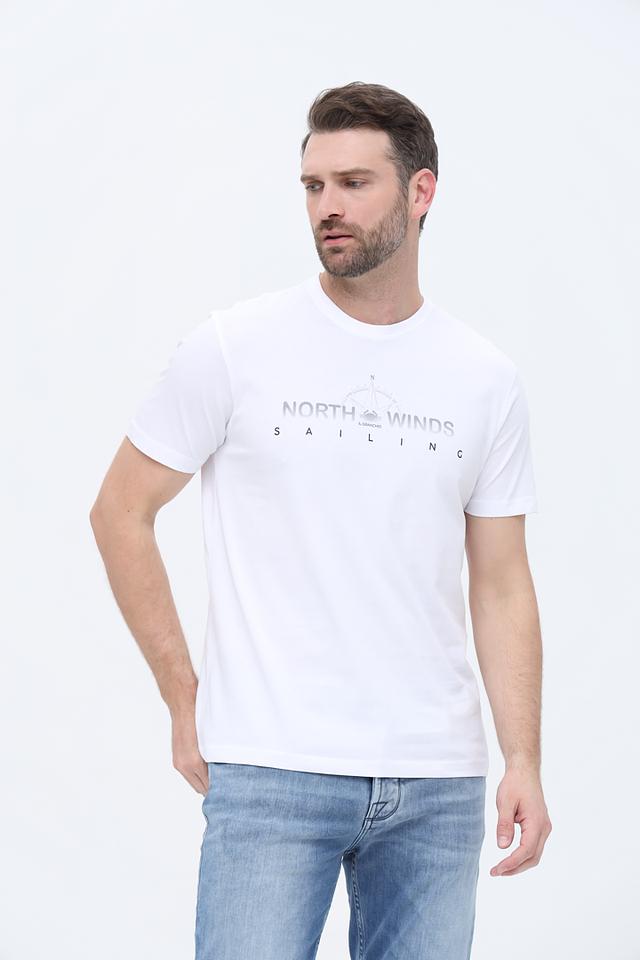 На передней части футболки расположен принт с надписью "NORTH WINDS SAILING" и изображением компаса, что придает ей стильный и морской вид. Классический крой и круглый вырез горловины делают эту футболку универсальной и подходящей для любого типа фигуры.