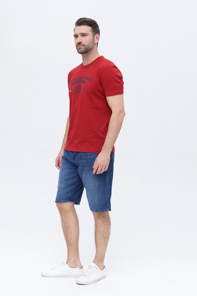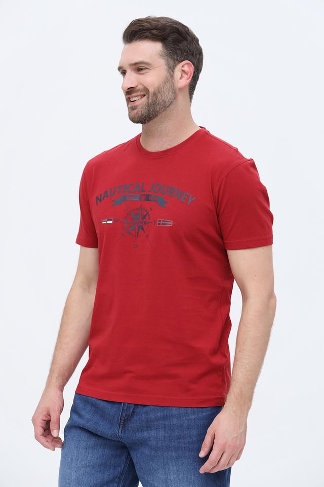 Футболка имеет классический прямой крой, который подходит для большинства типов фигур. Особенностью данной модели является яркий красный цвет и оригинальный принт на груди, выполненный в морской тематике. Принт включает в себя надпись "NAUTICAL JOURNEY" и изображение флагов.