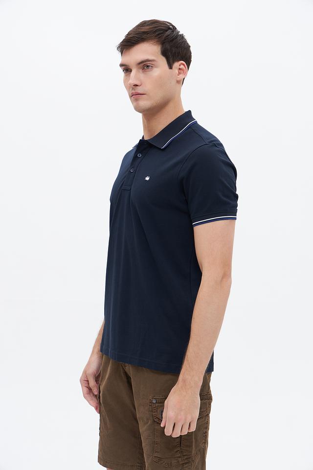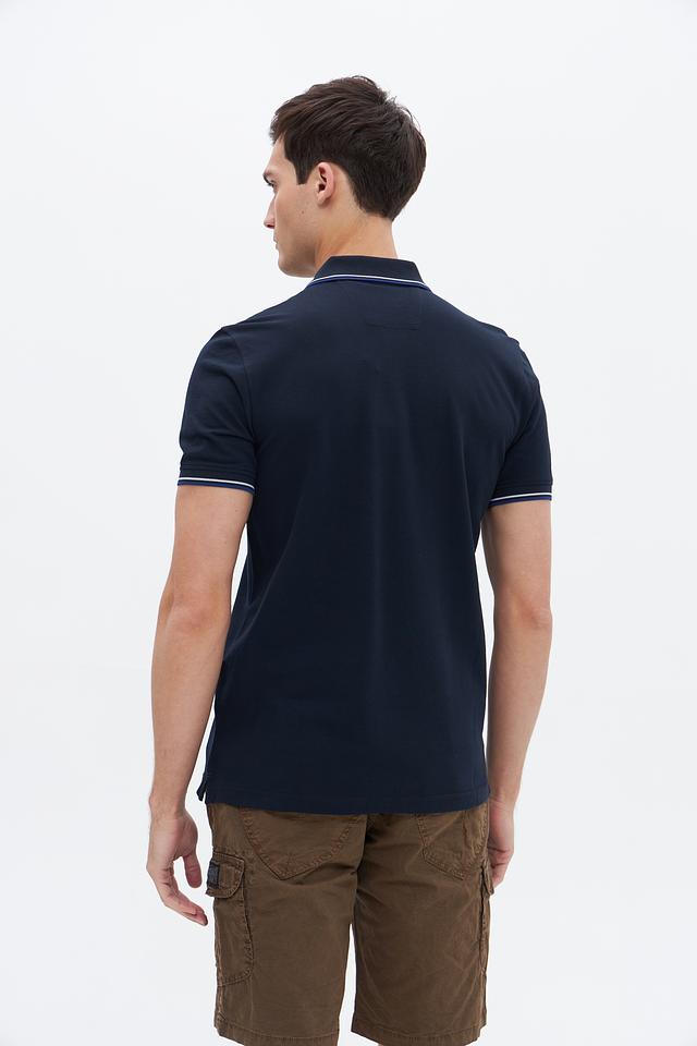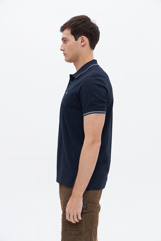 Классический крой поло идеально подходит для создания как повседневных, так и более формальных образов. Тёмно-синий цвет поло дополнен контрастной белой полоской на воротнике и рукавах, что придает изделию особый шарм и элегантность.