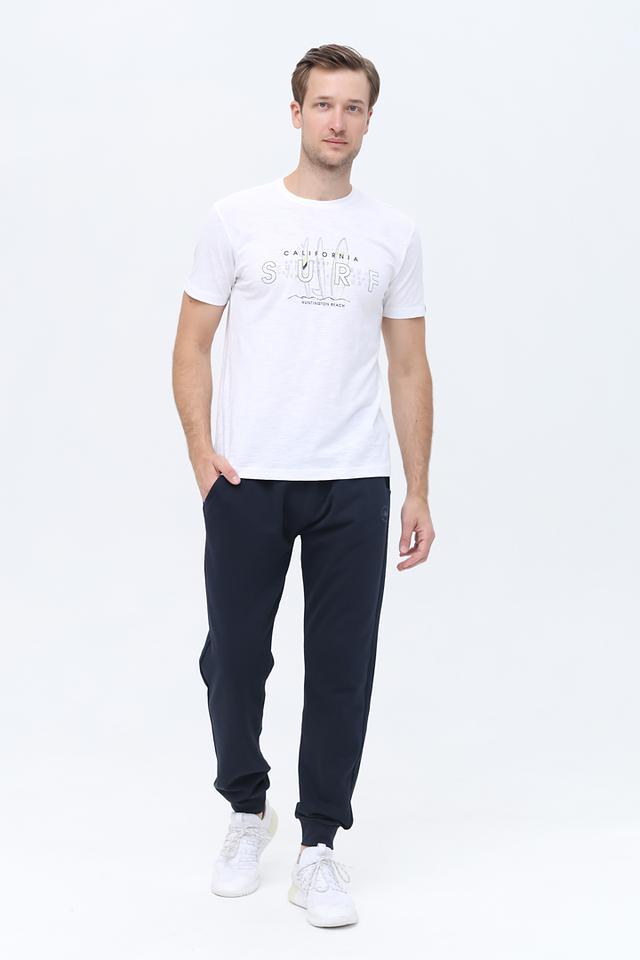 На передней части футболки расположен оригинальный принт с надписью "California Surf" и изображением волн, что придает ей непринужденный и летний вид. Круглый вырез горловины и короткие рукава делают эту футболку идеальной для теплой погоды.