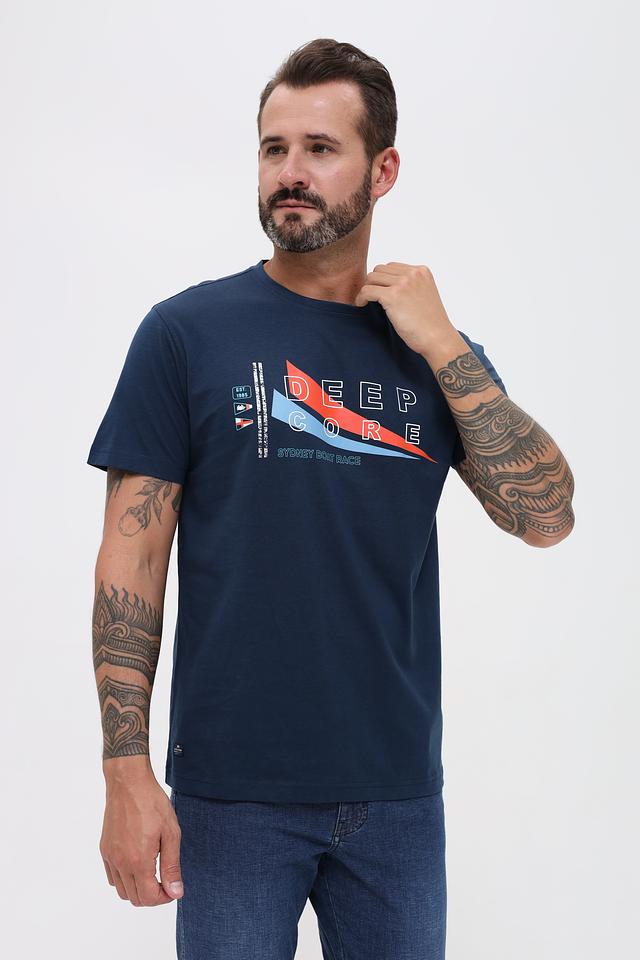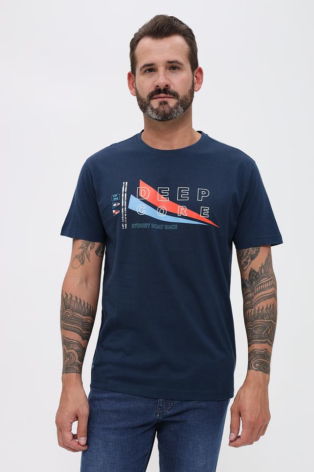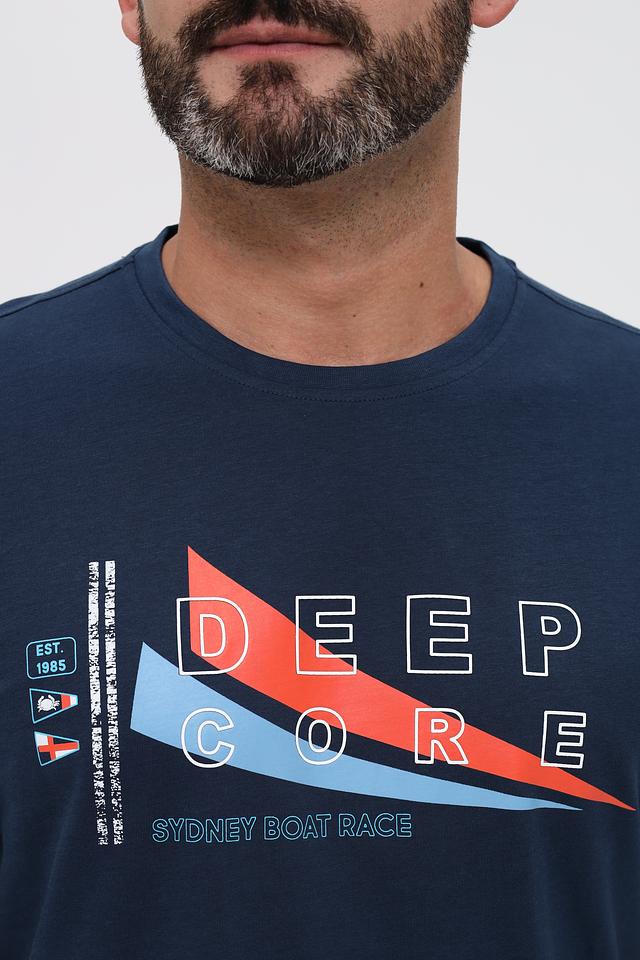 Основной цвет футболки – насыщенный синий, который отлично сочетается с ярким принтом на передней части. Принт выполнен в контрастных цветах – красном, белом и синем – и содержит надпись "DEEP CORE" и "SYDNEY BOAT RACE".