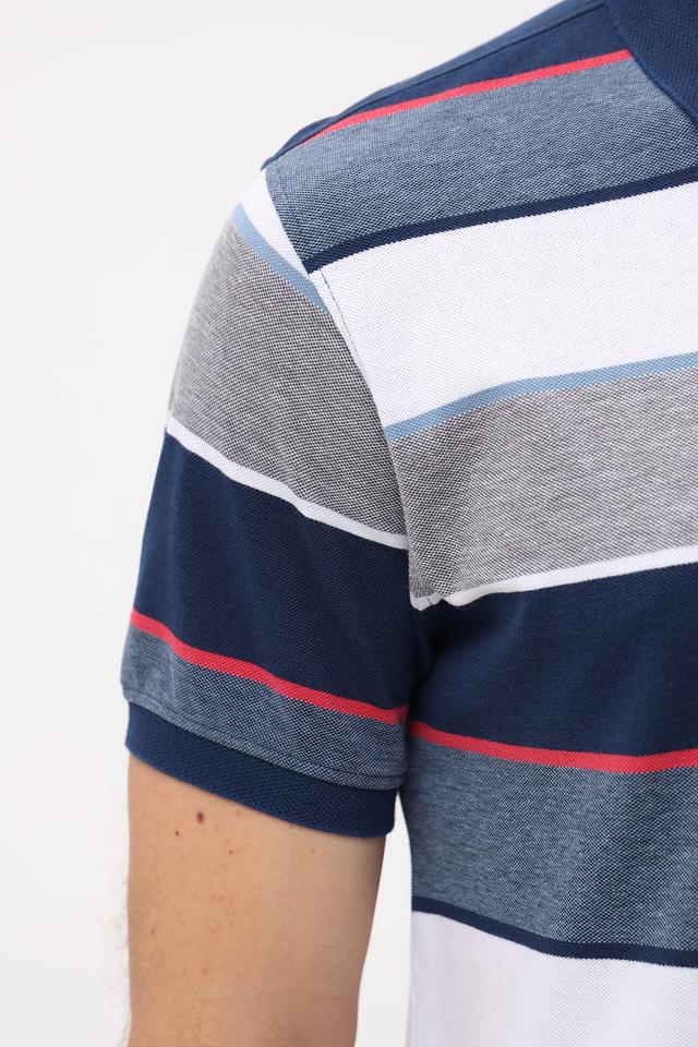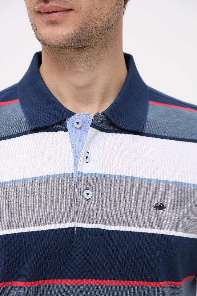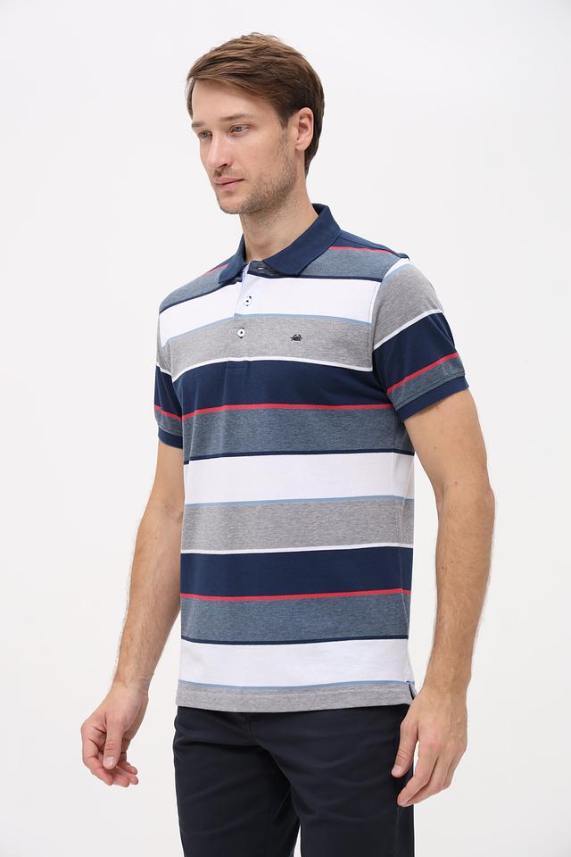 Основной цвет поло – синий, дополненный горизонтальными полосами белого, серого и красного цветов. Такое сочетание делает изделие ярким и привлекательным. На груди расположена небольшая эмблема бренда.