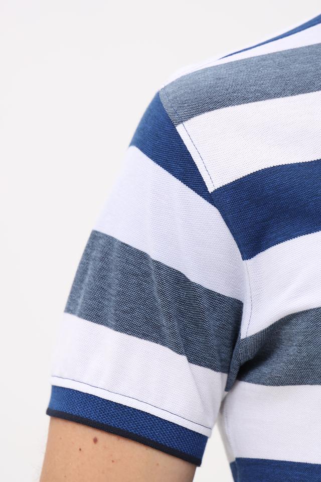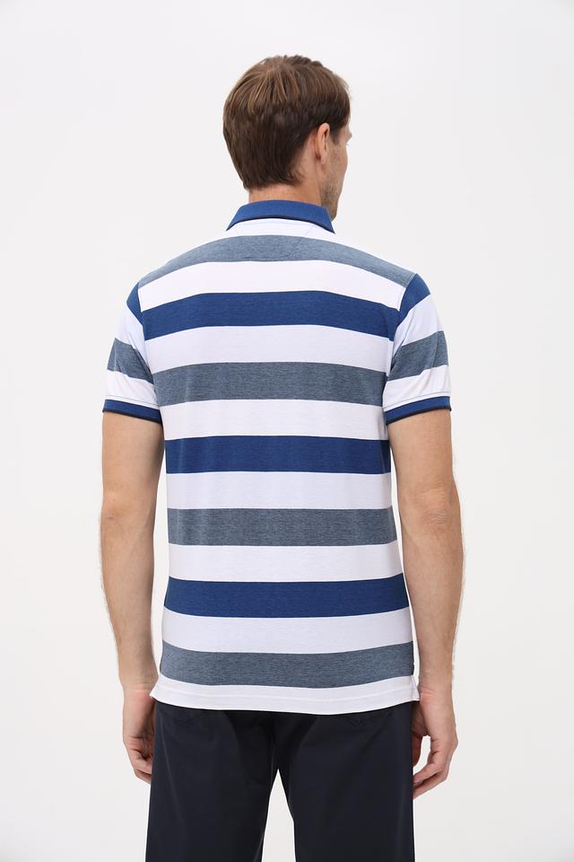 Поло выполнено в классическом крое с короткими рукавами и воротником-поло. Дизайн изделия представляет собой чередование горизонтальных полос синего, белого и серого цветов, что придает ему современный и динамичный вид. На левой стороне груди расположен нагрудный карман с логотипом бренда, добавляющий акцент и узнаваемость.