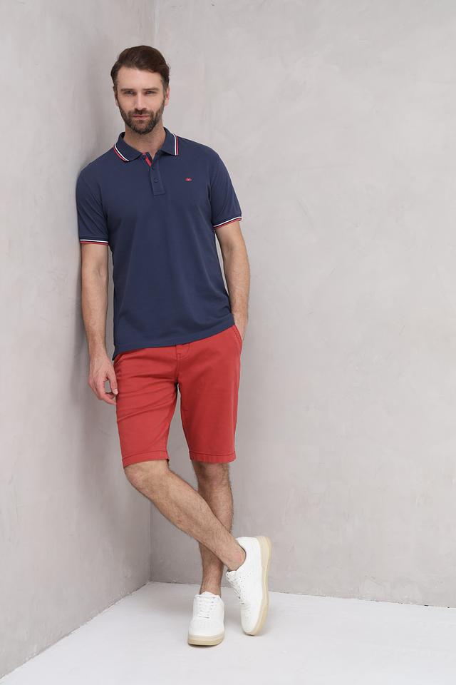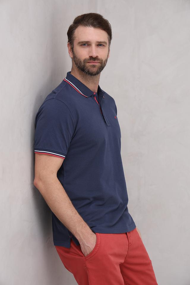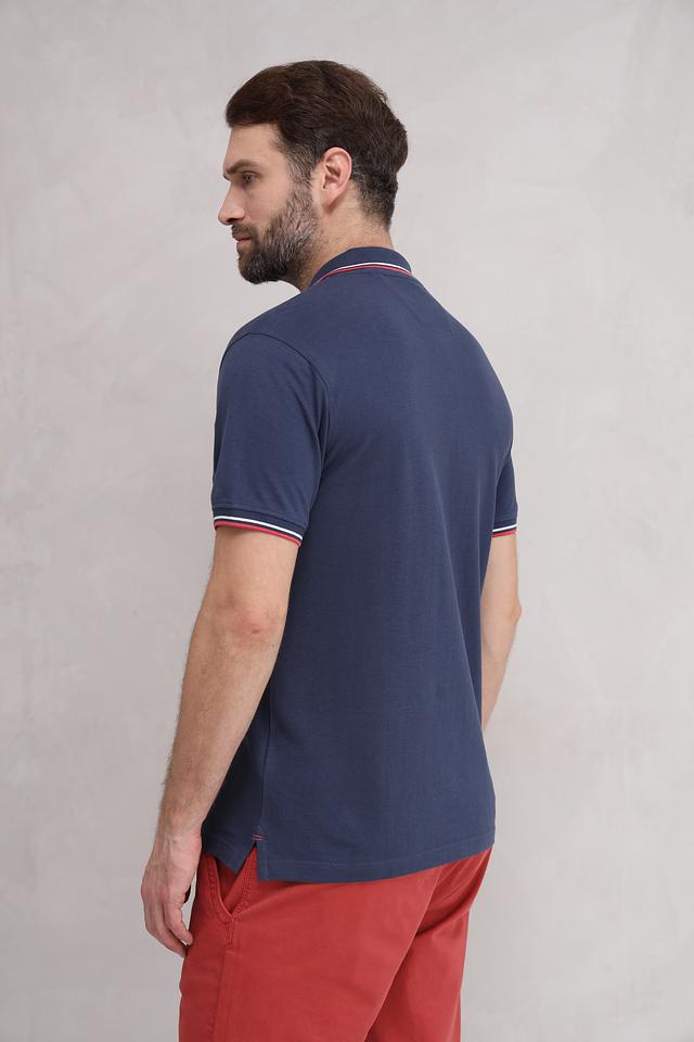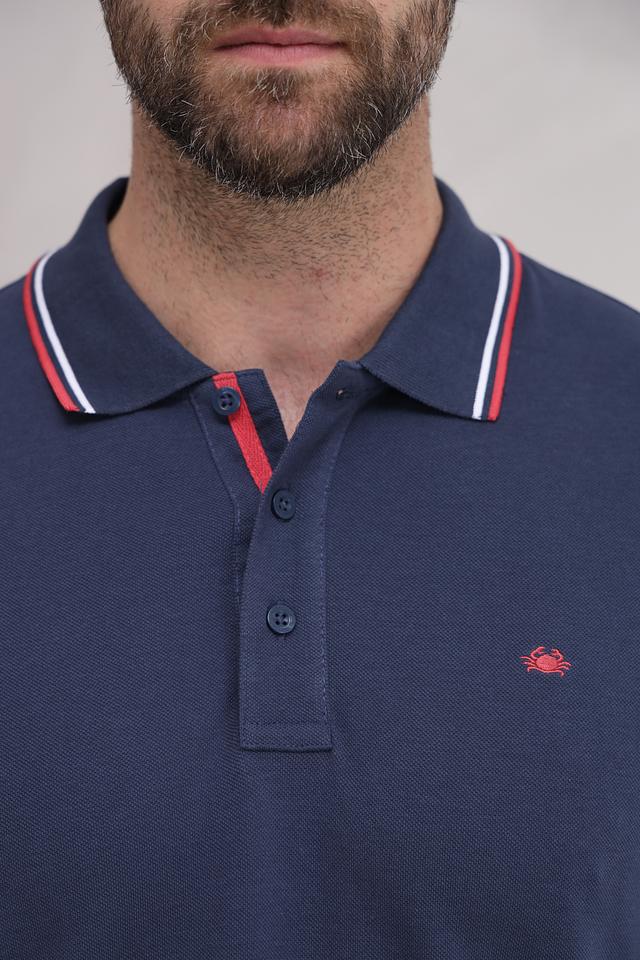 Это мужское поло от бренда Granchio выполнено в классическом стиле. Основной цвет – темно-синий, который отлично сочетается с красными и белыми полосками на воротнике и рукавах.