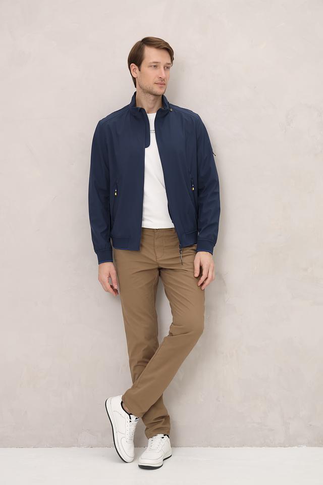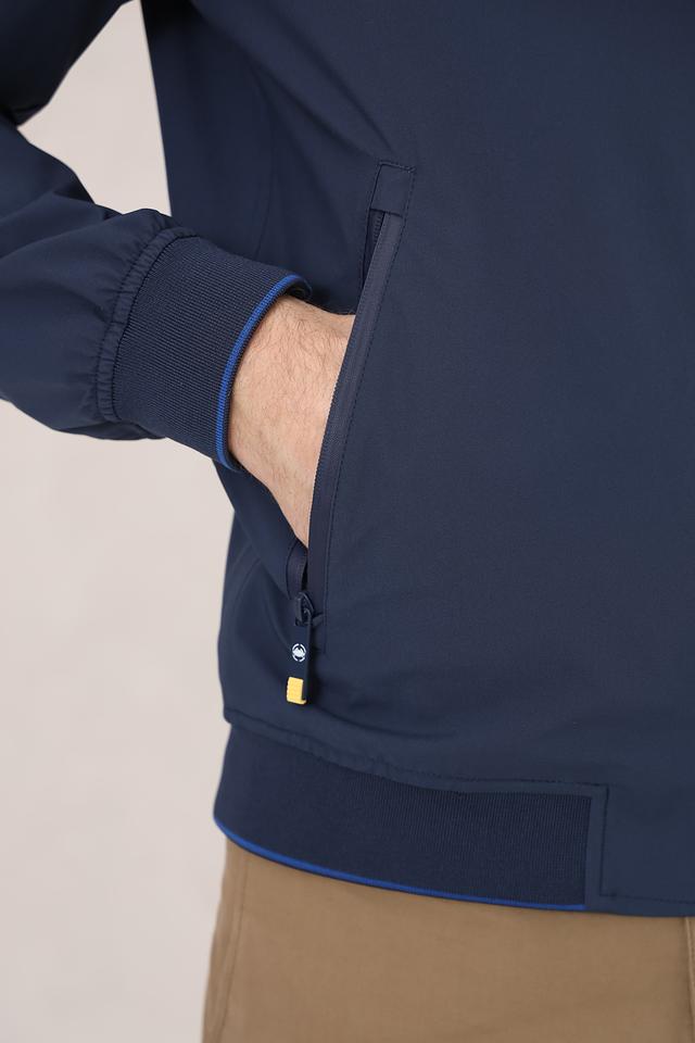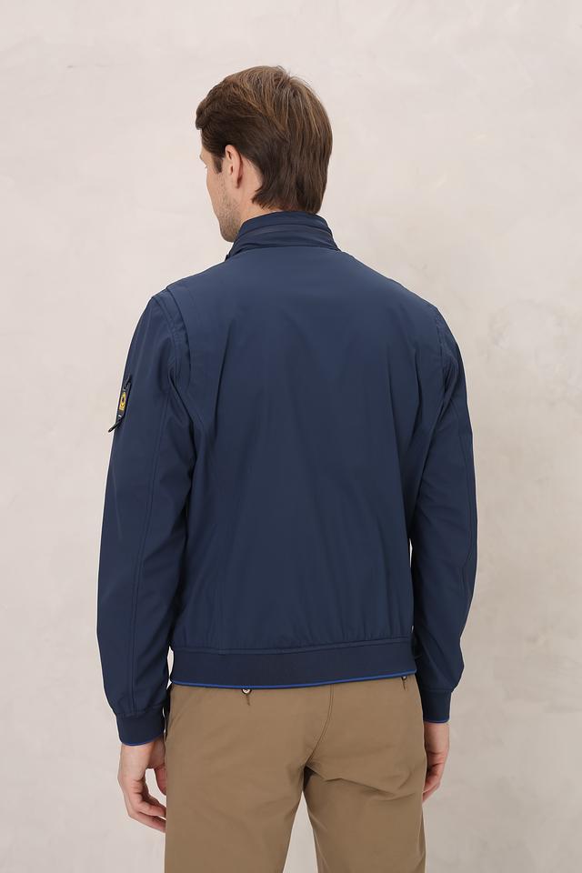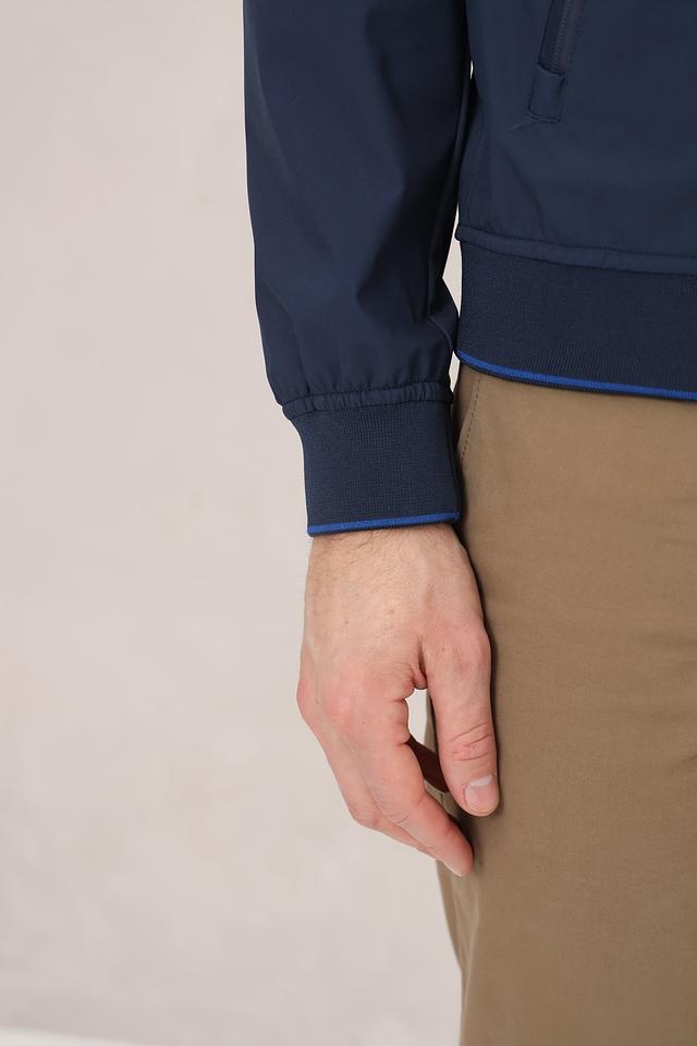 Куртка имеет классический крой, воротник-стойку и застежку-молнию. На рукавах расположены функциональные карманы на молнии, а манжеты и нижний край куртки отделаны эластичной тесьмой контрастного синего цвета.