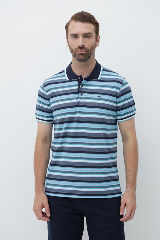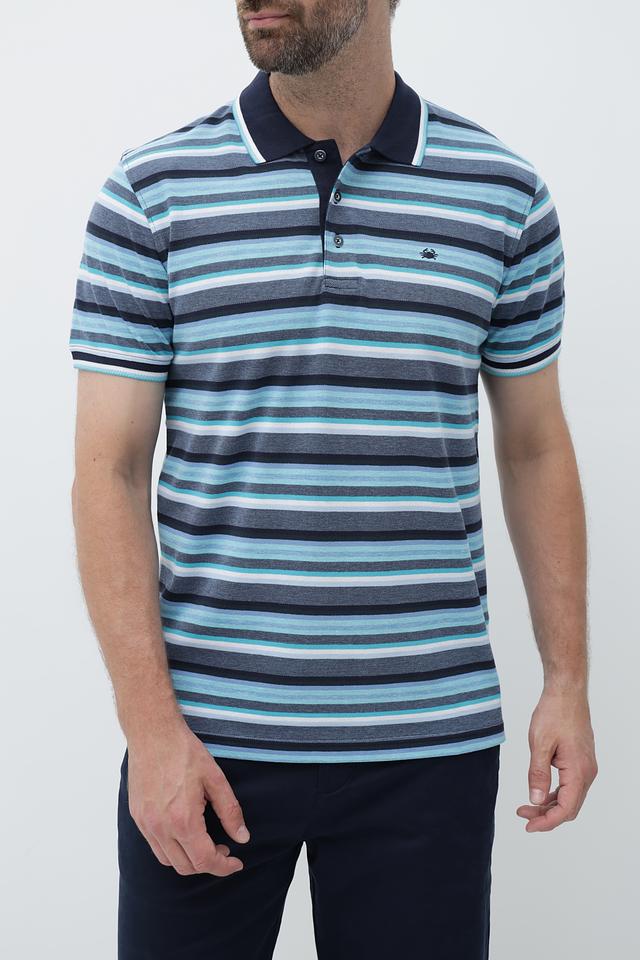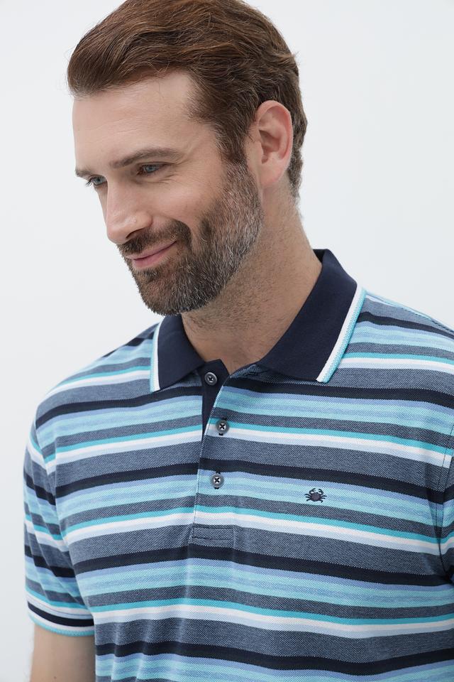 Это мужское поло от бренда Granchio выполнено в классическом крое с короткими рукавами. Основной цвет поло – синий, дополненный ярким полосатым рисунком в голубых, серых и белых тонах.
