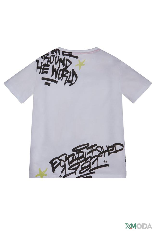 На передней части футболки также присутствует логотип бренда Guess. Задняя часть футболки оформлена яркими надписями в стиле граффити и небольшими звёздочками.