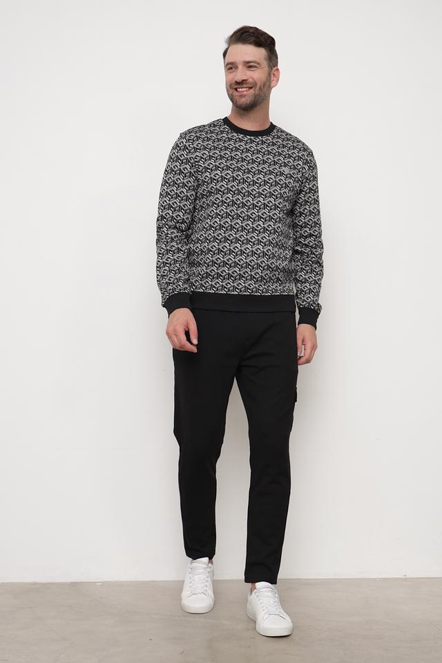 Мужской джемпер Guess серого цвета с оригинальным геометрическим рисунком. Изготовлен из мягкого и приятного к телу сочетания полиэстера и вискозы, обеспечивающего комфорт в носке. Отличный выбор для создания стильного повседневного образа. Состав: полиэстер 72%, вискоза 27%, эластан 1%