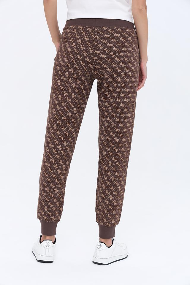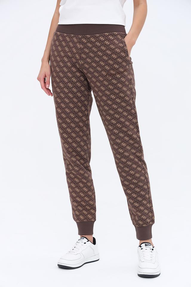 Женские спортивные брюки Guess коричневого цвета с фирменным логотипом по всей поверхности. Модель выполнена из мягкого хлопка с добавлением эластана для комфортной посадки и свободы движений. Состав: хлопок 95%, эластан 5%