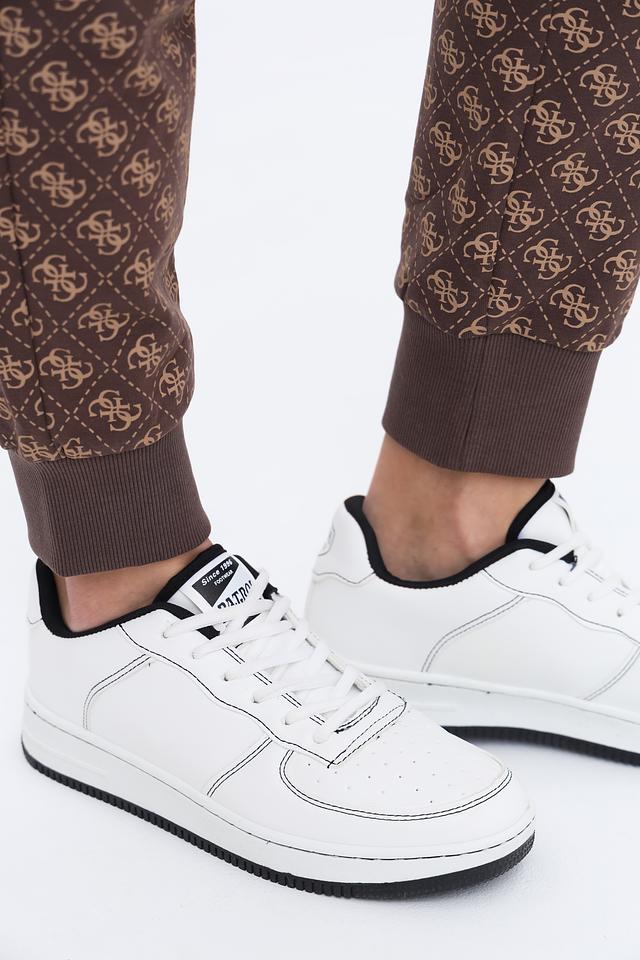 Брюки изготовлены из высококачественного хлопка (95%) с добавлением эластана (5%), что обеспечивает приятные тактильные ощущения и хорошую посадку по фигуре. Фирменный логотип бренда, повторяющийся по всей поверхности ткани, придает брюкам узнаваемый и стильный вид.