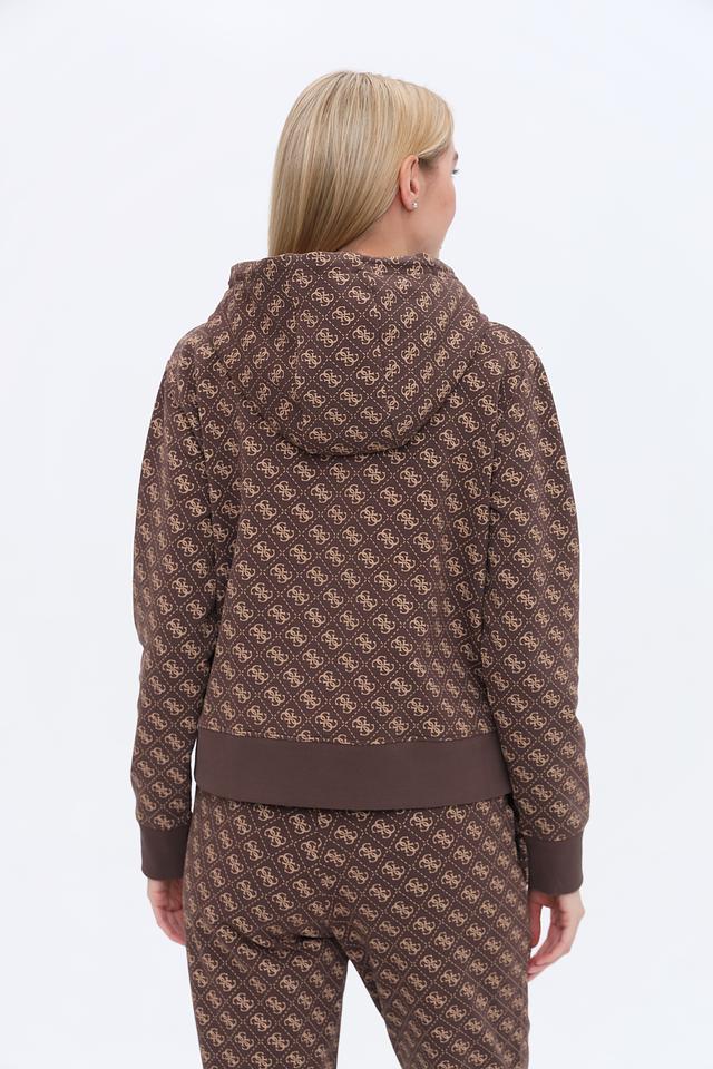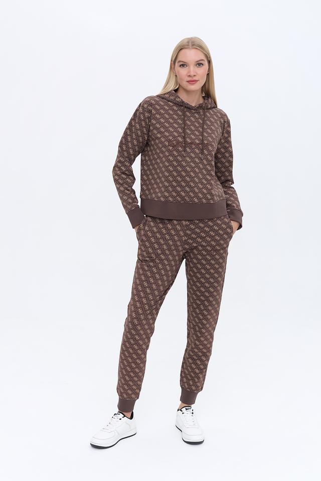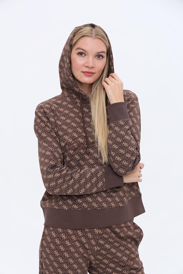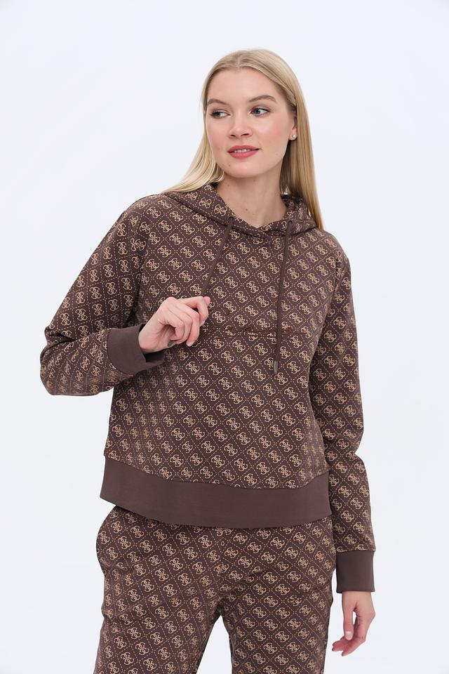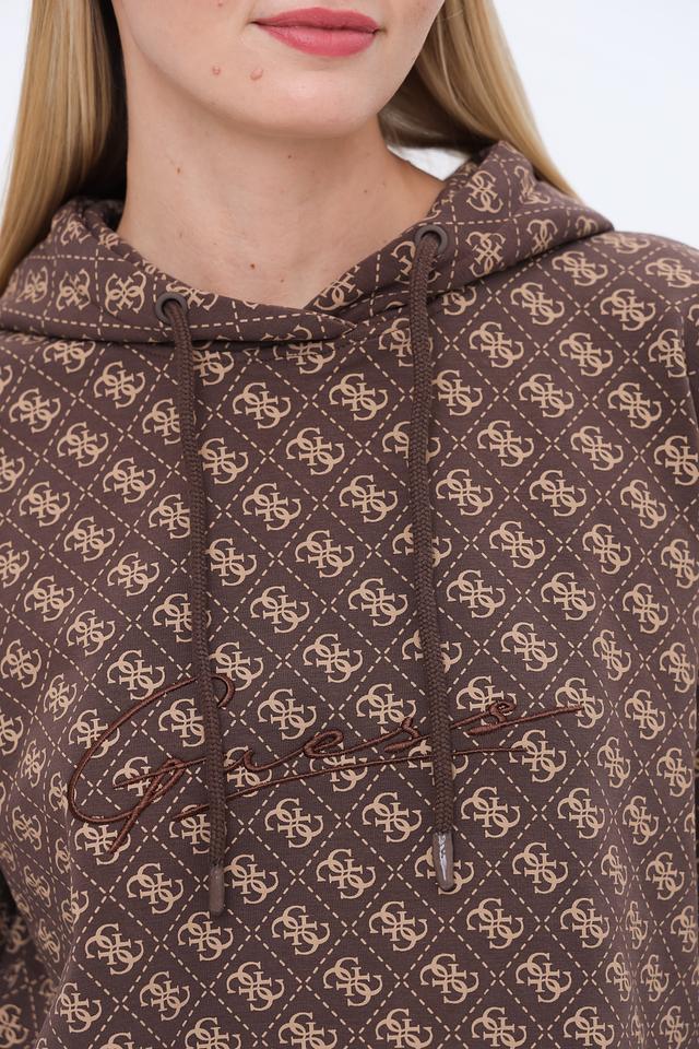Женский джемпер Guess коричневого цвета с капюшоном и узнаваемым логотипом бренда. Изготовлен из мягкого хлопка с добавлением эластана для комфорта и свободы движений. Идеальный выбор для создания стильного повседневного образа. Состав: хлопок 95%, эластан 5%