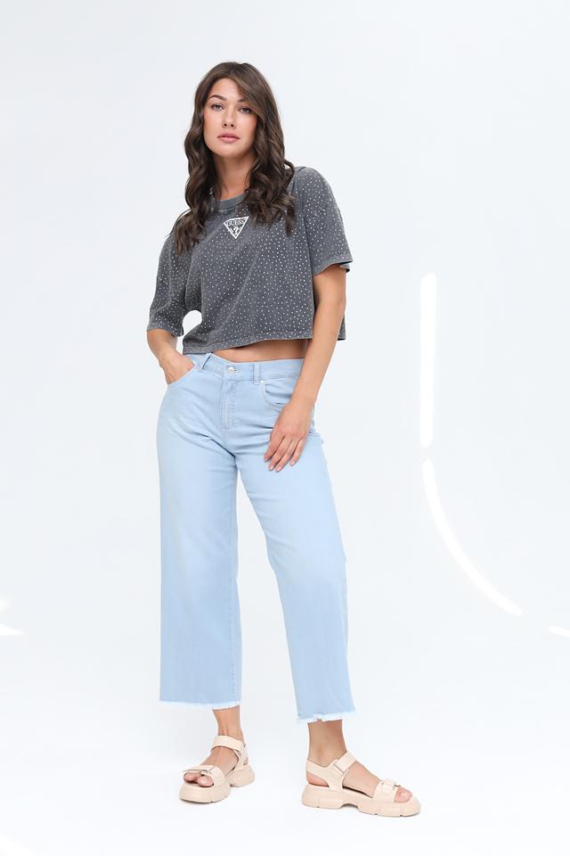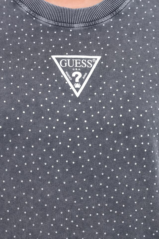 Женская футболка Guess серого цвета с принтом в виде логотипа бренда и мелкого рисунка. Укороченный крой и хлопковый состав обеспечивают комфорт и стильный образ. Состав: хлопок 100%