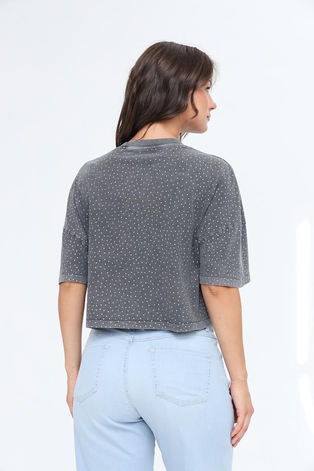 Футболка имеет укороченный крой, который подчеркивает фигуру и придает образу современный вид. Серый цвет с мелким рисунком и логотип бренда делают эту модель узнаваемой и привлекательной.