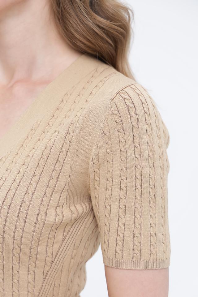 Бежевое платье от Guess из вязаного трикотажа с V-образным вырезом. Приталенный силуэт подчеркивает фигуру, а короткий рукав делает модель удобной и универсальной. Состав: вискоза 62%, полиэстер 38%