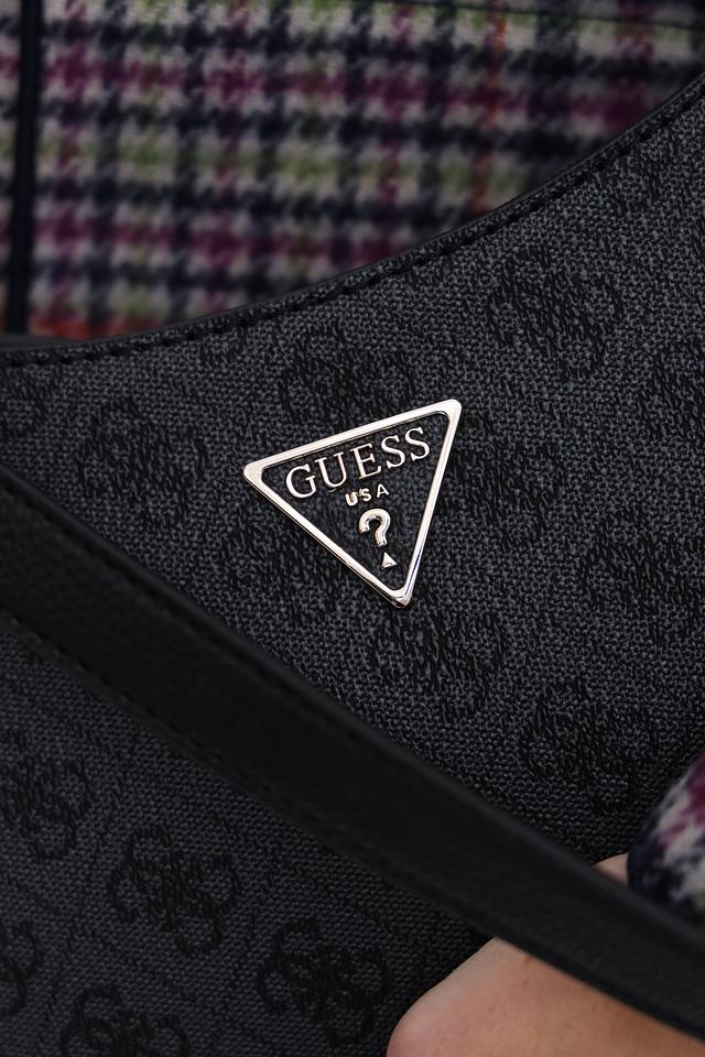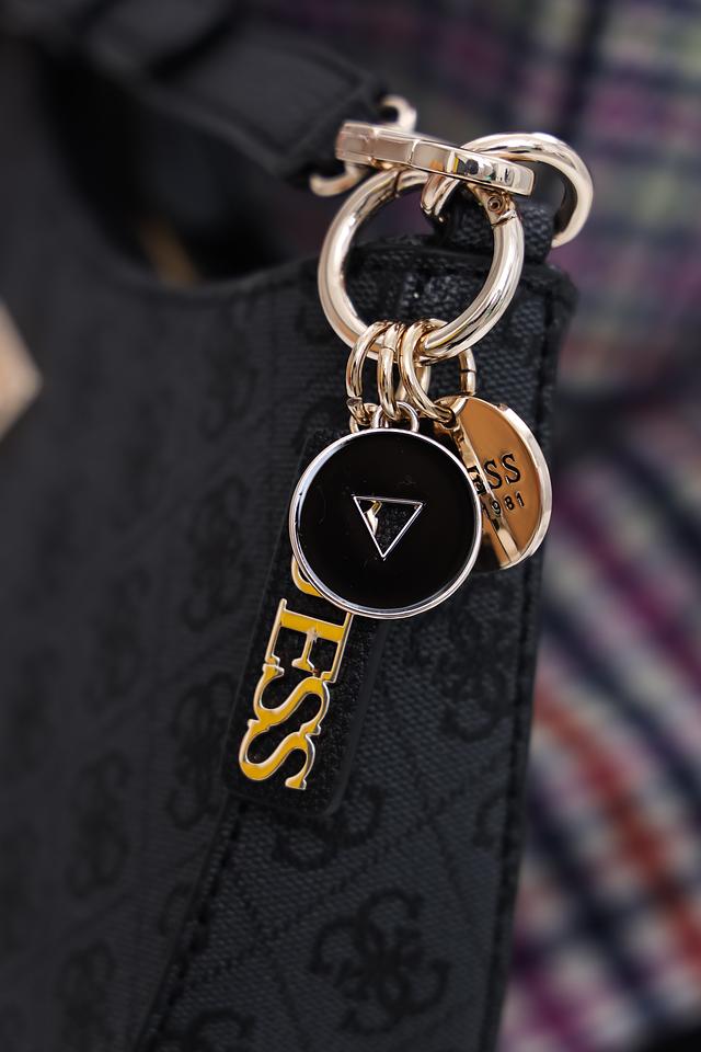 Модель имеет удобную форму и размер, идеально подходящие для повседневного использования. Золотистая фурнитура и декоративный брелок с логотипом Guess придают сумке особый шарм и элегантность.
