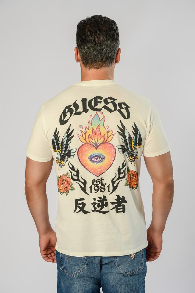 Дизайн футболки включает в себя яркий принт на спине с изображением сердца, обрамленного цветами и ласточками, а также логотип бренда Guess. На груди расположен небольшой логотип бренда и иероглифы.
