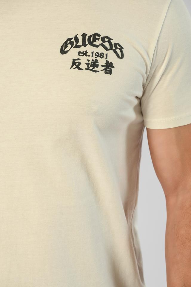 Бежевая футболка Guess с оригинальным принтом на спине и спереди. Изготовлена из 100% хлопка, обеспечивающего комфорт и воздухопроницаемость. Стильный и удобный выбор для повседневного образа. Состав: хлопок 100%
