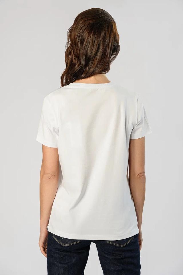 Белая футболка Guess с узнаваемым логотипом в виде треугольника с золотым принтом. Изготовлена из мягкого хлопка с добавлением эластана для комфорта и хорошей посадки. Состав: хлопок 95%, эластан 5%