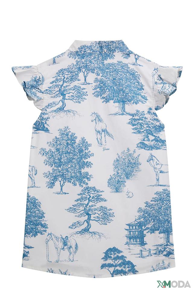 Особенностью данной модели является уникальный принт в виде пейзажа с изображением деревьев, пагод и лошадей, выполненный в голубых и белых тонах. Воротник-стойка и короткие рукава с воланами придают блузе изящный и романтичный вид.