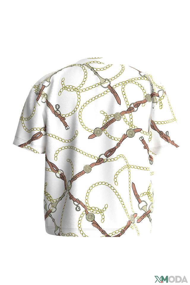 Детская футболка Guess белого цвета с ярким принтом в виде цепочек и логотипа бренда. Изготовлена из мягкого хлопка с добавлением эластана для комфорта и свободы движений. Состав: хлопок 95%, эластан 5%