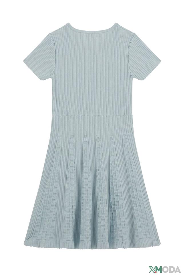 Модель имеет короткие рукава и круглый вырез горловины. Приталенный верх платья плавно переходит в плиссированную юбку, что придает образу легкость и воздушность. Небольшой логотип бренда Guess украшает платье спереди.