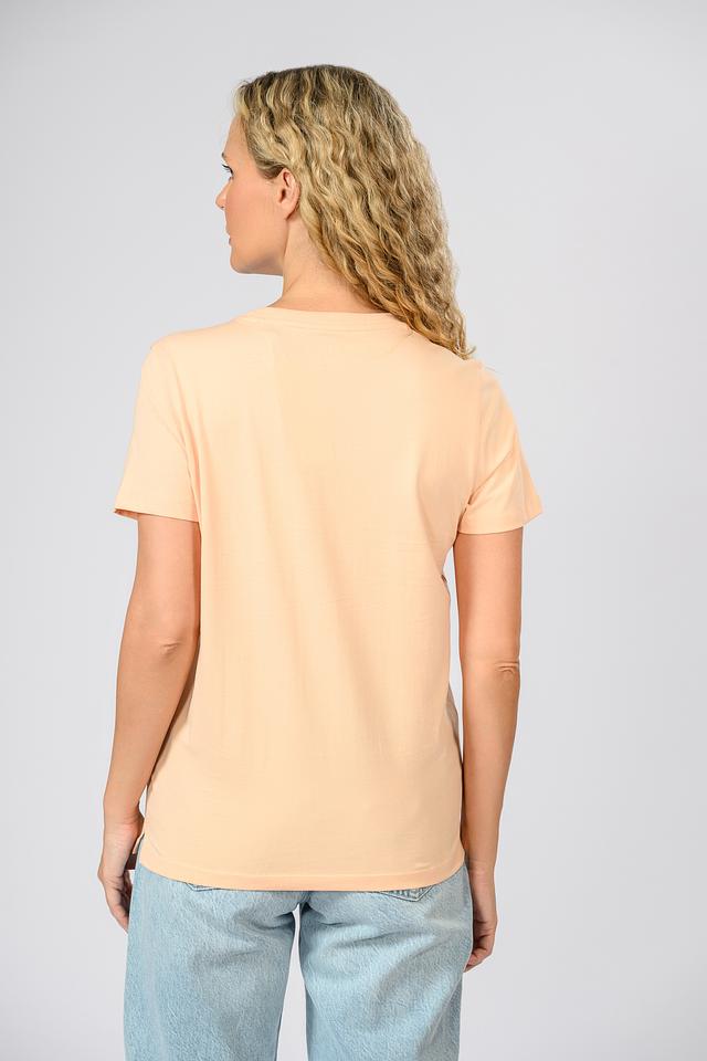 Женская футболка Guess персикового цвета с ярким принтом в стиле ретро. Изготовлена из 100% хлопка, обеспечивающего комфорт и воздухопроницаемость. Стильный образ для повседневной носки. Состав: хлопок 100%