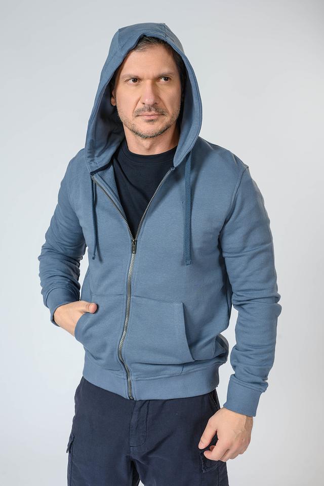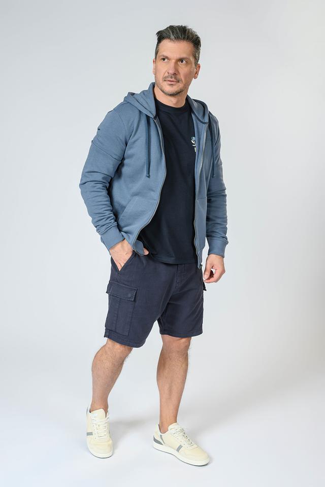 Мужская толстовка от бренда Guess выполнена в спокойном синем цвете. Модель оснащена удобной молнией во всю длину и капюшоном с регулируемыми шнурками.