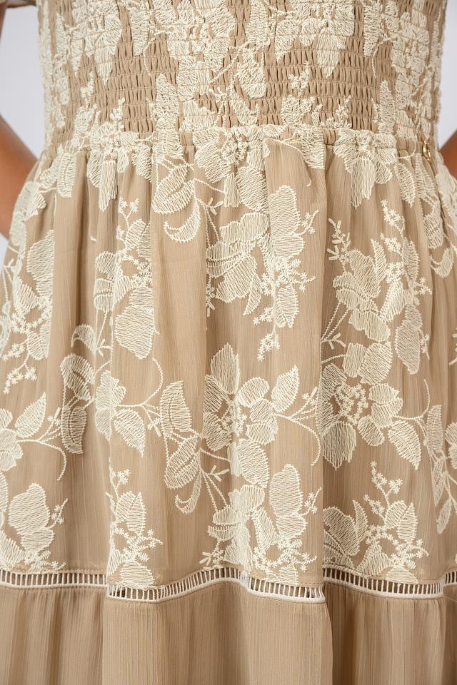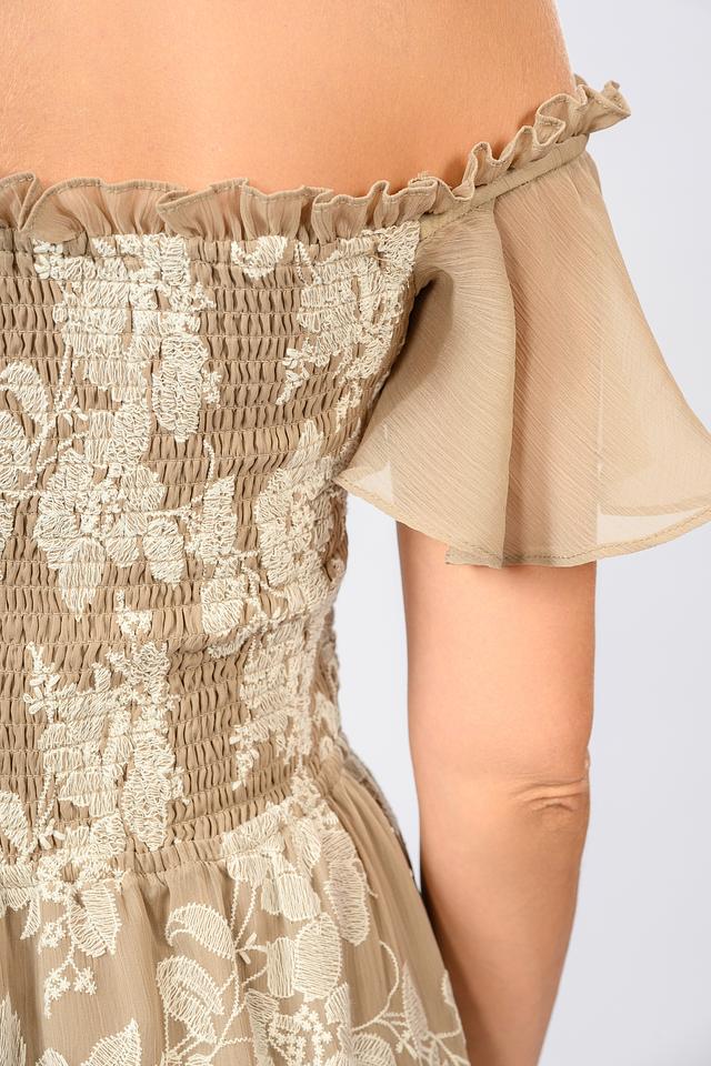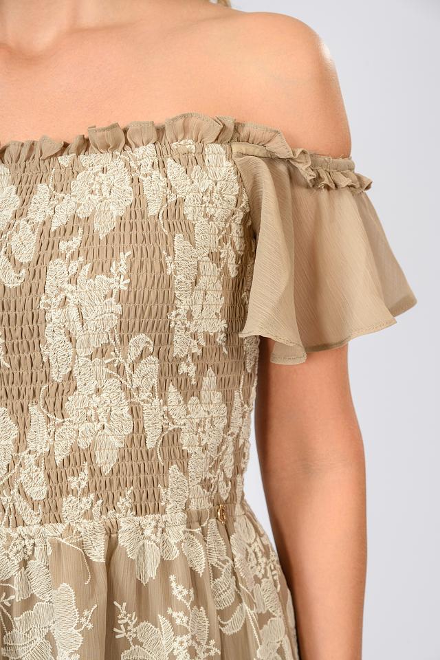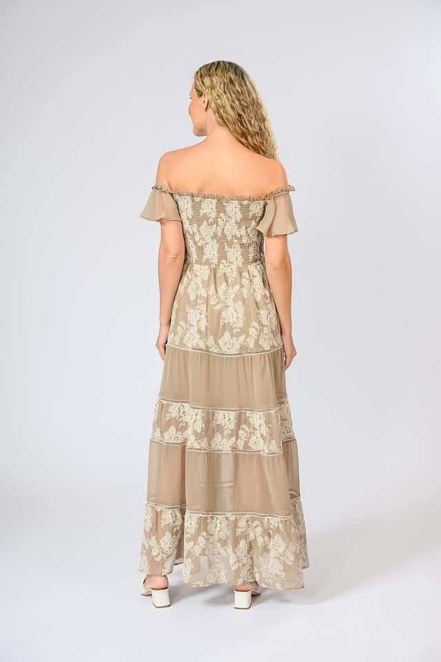 Модель имеет длину макси, открытые плечи и короткие рукава-воланы, что делает ее идеальным выбором для летних вечеров и особых случаев. Лиф платья выполнен с использованием эластичной ткани, обеспечивающей комфортную посадку по фигуре. Многослойная юбка придает платью легкость и воздушность.