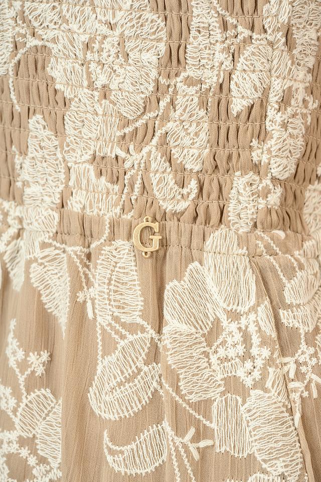 Это элегантное платье от бренда Guess станет прекрасным дополнением вашего гардероба. Платье выполнено в нежном бежевом цвете и украшено изысканным цветочным принтом, который придает ему особый шарм.