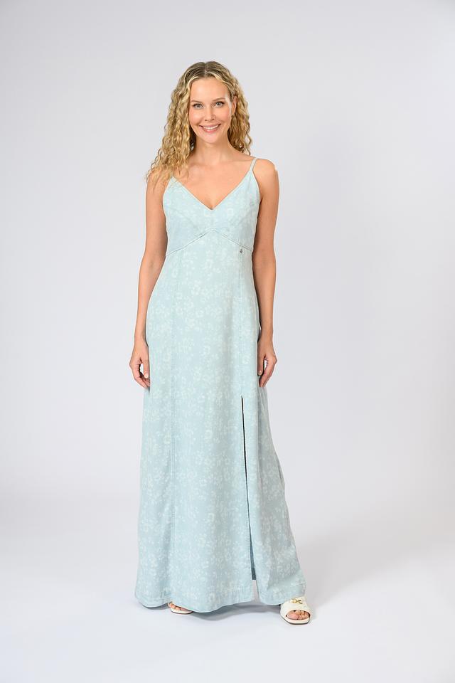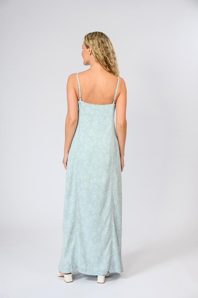Модель имеет прямой силуэт, тонкие бретели и V-образный вырез, который подчеркивает линию декольте. Боковой разрез добавляет образу легкости и свободы движений. Платье выполнено из сочетания луоселла и вискозы, что обеспечивает комфорт и приятные ощущения при носке.
