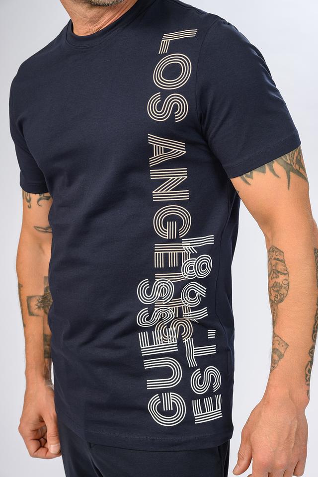 Мужская футболка Guess синего цвета с ярким принтом "Los Angeles". Изготовлена из мягкого хлопка с добавлением эластана для комфорта и свободы движений. Стильный и удобный выбор для повседневного образа. Состав: хлопок 95%, эластан 5%