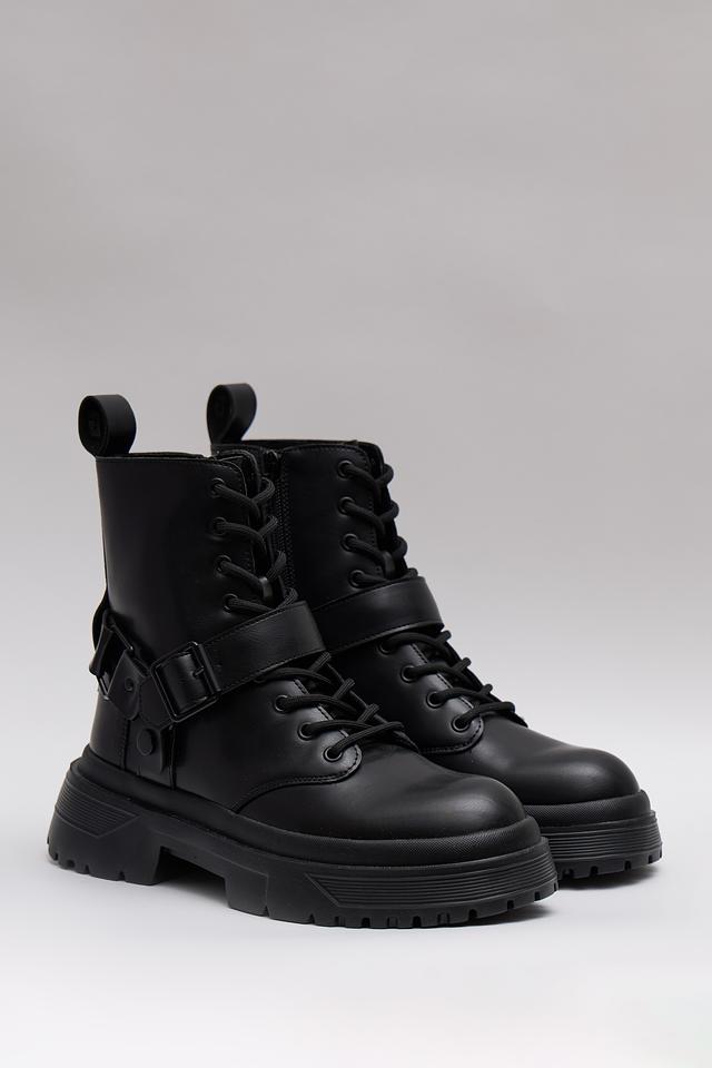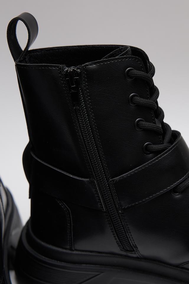 Ботинки изготовлены из высококачественного полиуретана, что гарантирует их износостойкость и устойчивость к воздействию внешних факторов. Массивная платформа обеспечивает комфорт при ходьбе и добавляет образу дерзости. Декоративный ремень с пряжкой придает ботинкам особый шарм и оригинальность.