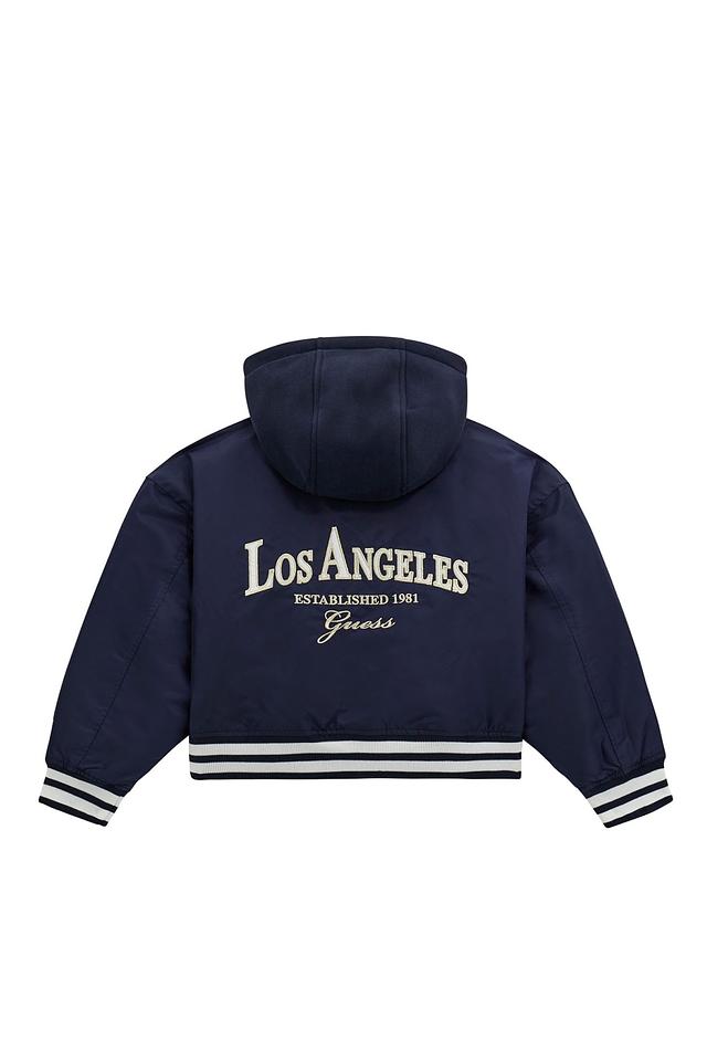 Стильная куртка Guess синего цвета для девочки, украшенная логотипом бренда и белыми полосами. Модель с капюшоном и застежкой-молнией станет отличным дополнением к детскому гардеробу. Состав: полиамид 100%