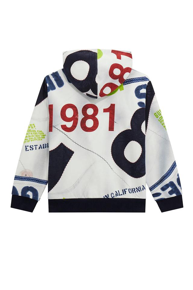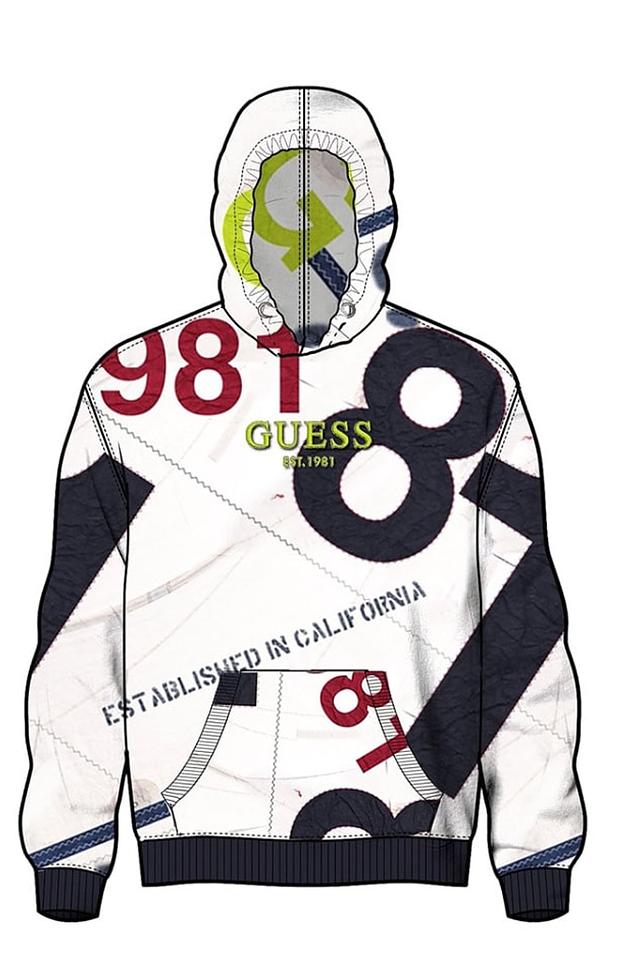 Дизайн джемпера привлекает внимание сочетанием белого фона и ярких элементов с логотипом бренда Guess. На изделии присутствуют надписи и цифры, выполненные в красном, синем и других цветах, создавая динамичный и запоминающийся образ.