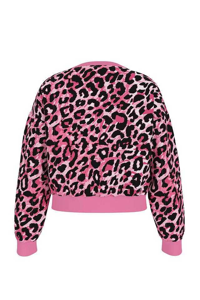 Джемпер имеет свободный крой, не сковывающий движений, и круглый вырез горловины. Основной цвет – розовый, а главным акцентом является эффектный леопардовый принт, покрывающий большую часть изделия.